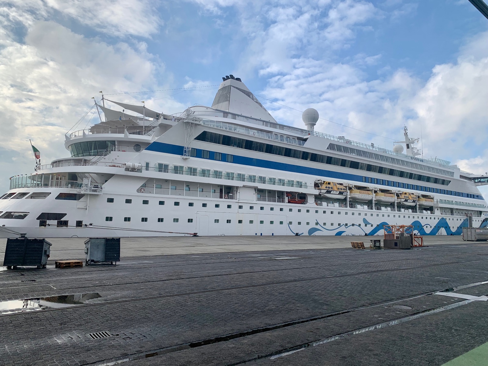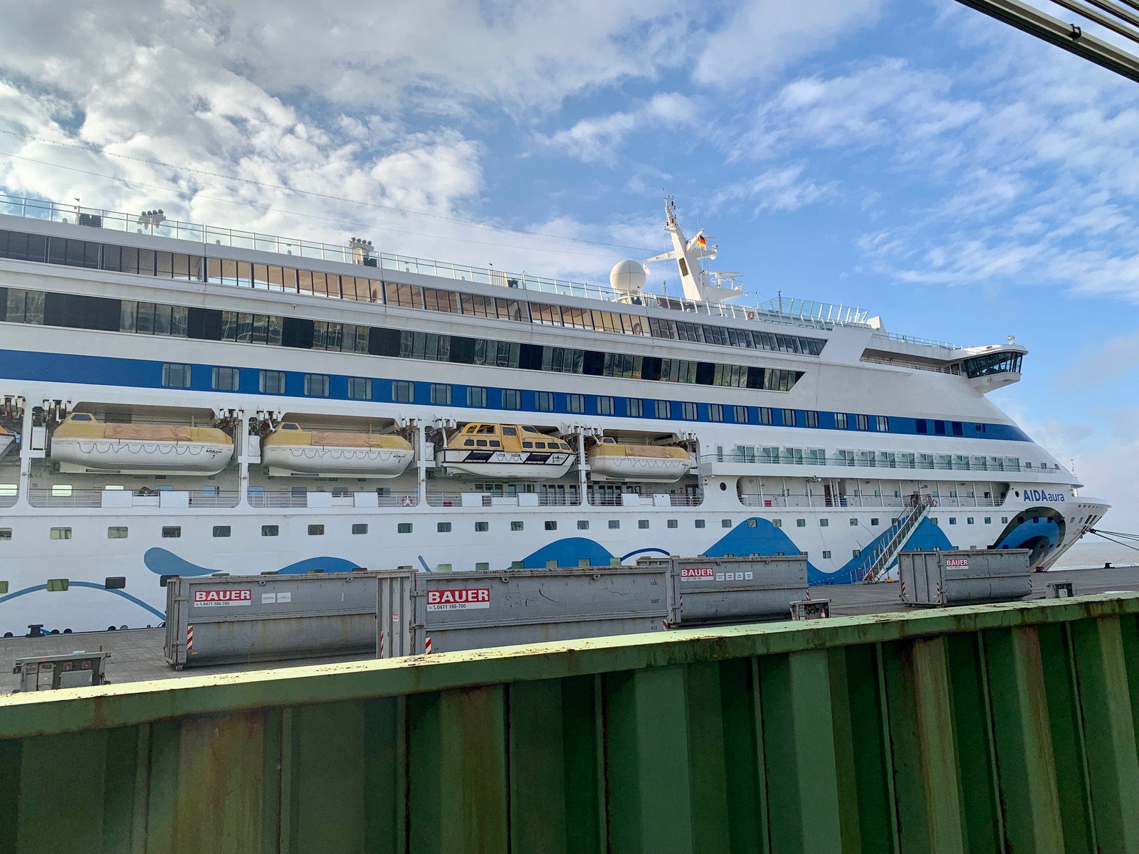 Melde mich auch mal wieder zu Wort . Die Aura hat mal wieder den Liegeplatz gewechselt. Sie liegt wieder direkt am Passagierkai , nachdem dort in den letzten Tagen die Artania , die MS3 und die Hanseatic Nature abgefertigt wurden. Heute lag auch ein Bunkerschiff längsseits . An der Flagge und den Namen hat sich aber nichts geändert.