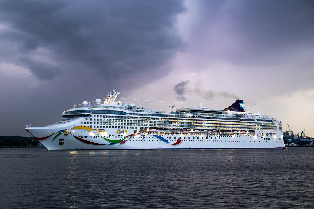 Die "Nieuw Statendam" fährt am 15.07.2022 um 16:11h unter einem faszinierenden Wolkenpanorama ihr Auslaufmanöver auf der "Kieler Förde"