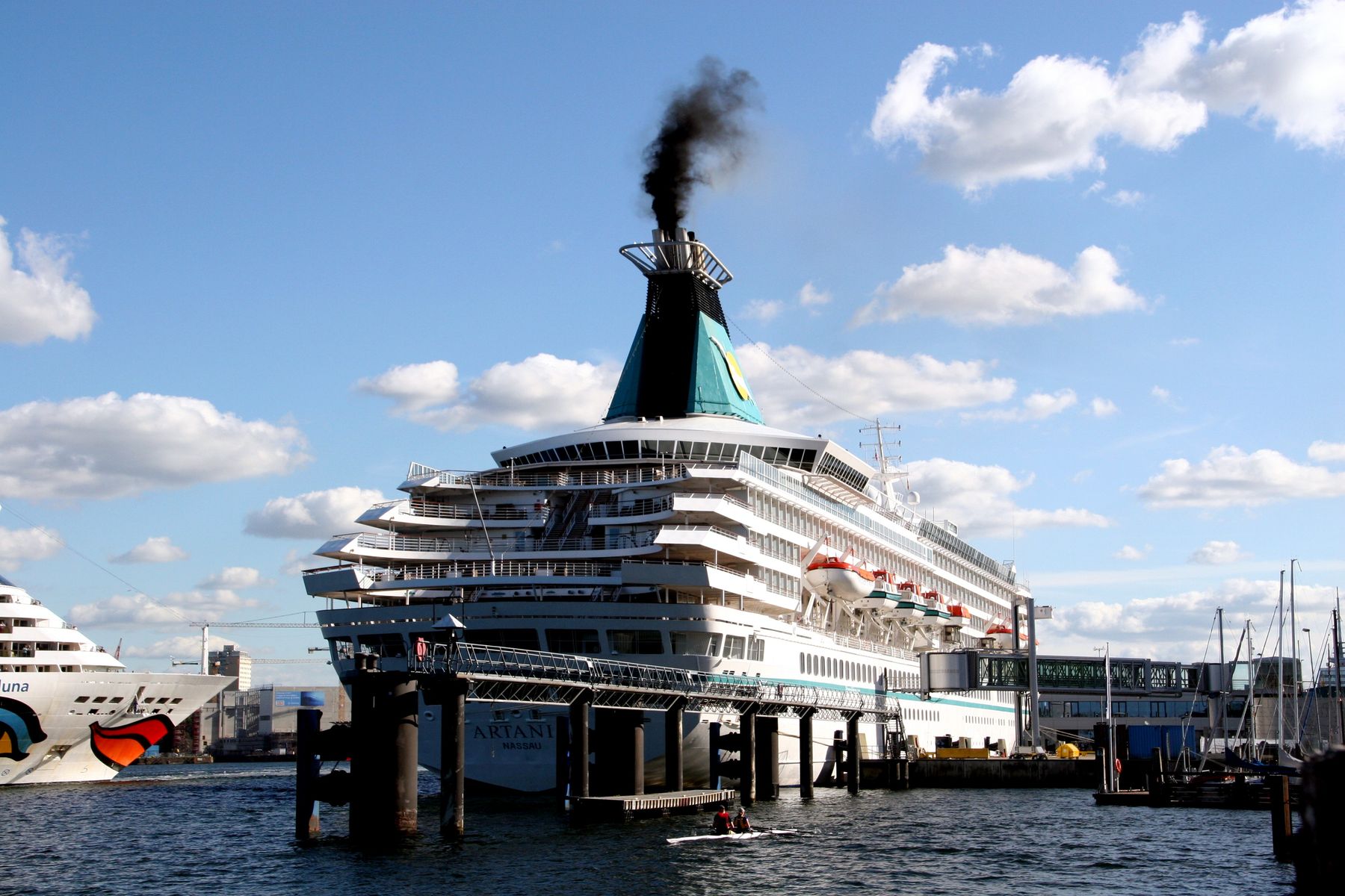 Die Artania mit einem kräftigen "Heizergruß" an ihrem "Liegeplatz 28" am Ostseekai in Kiel