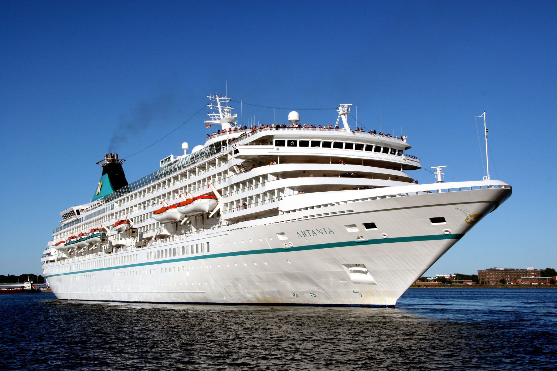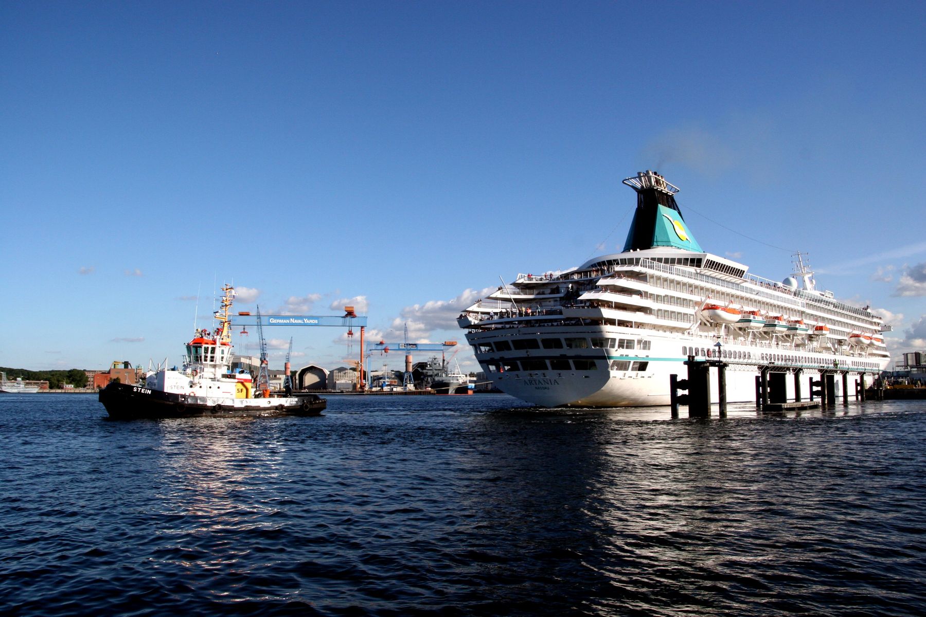Ein Schlepper wartet auf das Ablegemanöver der Artania mit Schlepperhilfe