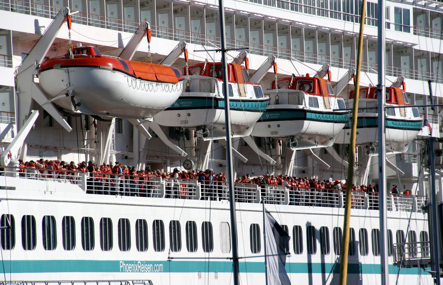 Eine klassische Rettungsübung für die Passagiere am 11.07. 2022 auf der Artania an ihrem "Liegeplatz 28" am Ostseelai in Kiel