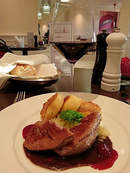 - Hauptgerichte: Die Garnelen werden mit einer Fenchelstange und Boullabaisse-Reise serviert, das Rinderfilet mit Rahmkohlrabi, Dorade mit Gemüsecouscous, das Gemüse fehlt leider. Statt Lammkeule gab es Boeuf Bourguignon. Die Entenbrust war mit Kartoffel-Spitzkohl-Püree.