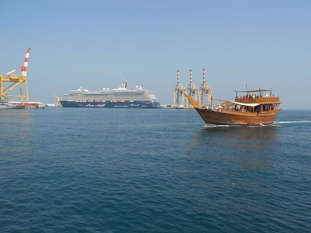 Wir lagen mit der Mein Schiff in Dubai im alten Hafen außerhalb. Dort hatte man Backbord einen Blick in die Stadt.