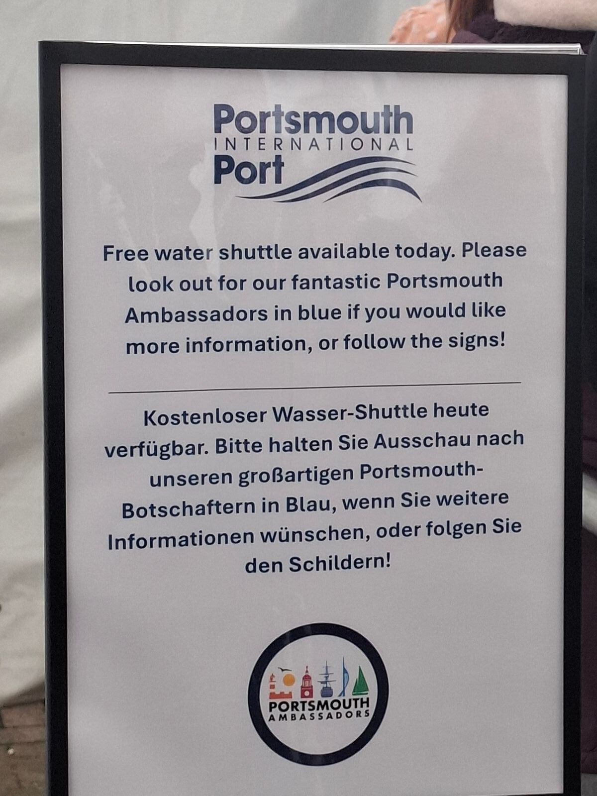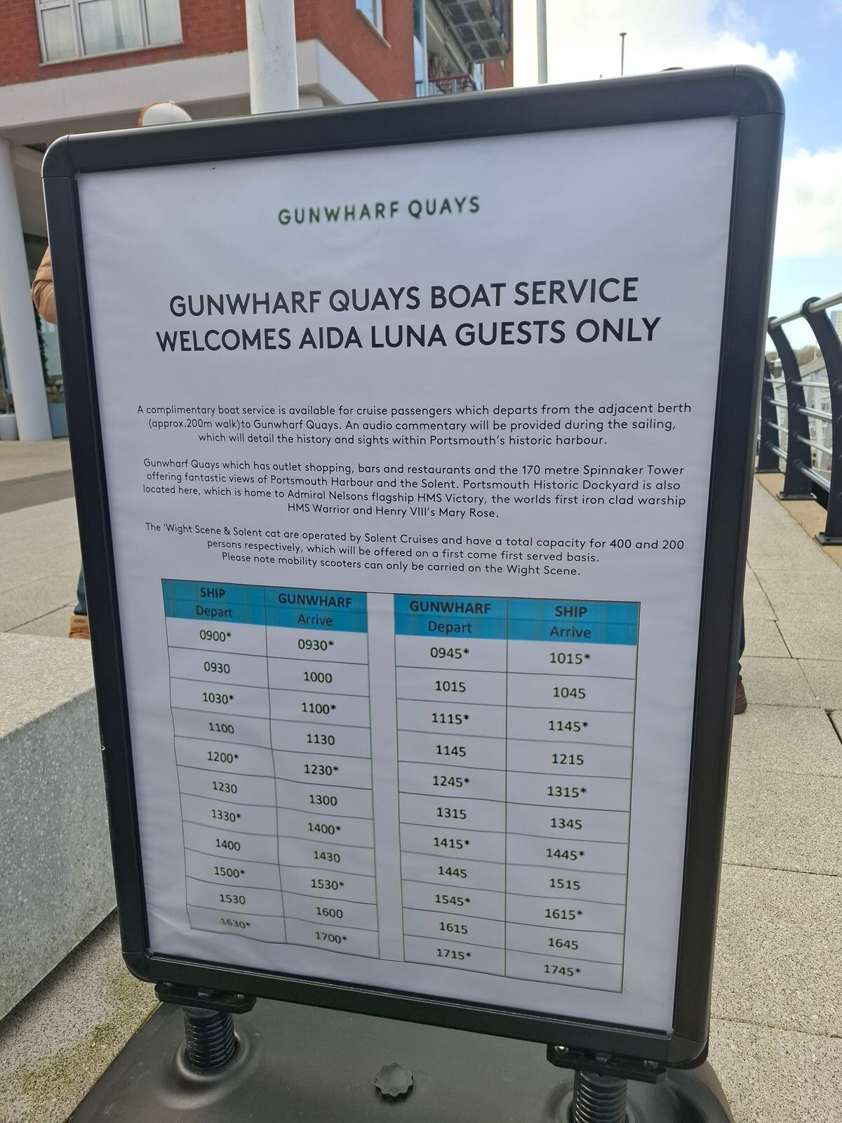 Als wij am 13. Juli mit der AIDASol in Portsmouth waren, wurden wir sofort zu einem Rundfahrtboot geleitet, das uns nach Gunwharf Quays (beim Spinnaker Tower) brachte. Wir sahen auch Busse am Kreuzfahrtterminal, hörten aber später von Mitpassagieren, dass diese nicht weiter als bis zum Ausgang/Eingang des Terminals fuhren. Der Kapitän des Rundfahrtboots erzählte während der Fahrt einiges über den Hafen von Portsmouth. Er erwähnte übrigens auch, dass dies ein neuer Service sei, der derzeit noch nur gelegentlich eingesetzt wird.