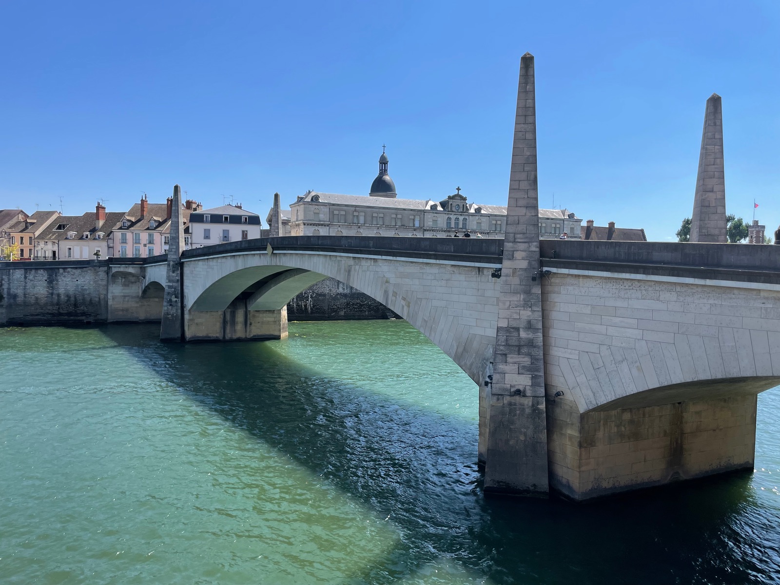 Heute Morgen dann Halt in Mâcon, dem Sitz der Präfektur Saône-et-Loire mit 34.000 Einwohnern. Die Stadt bzw. die Weiterfahrt von der Brücke St. Laurent unterbrochen, weswegen extra ein Umleitungskanal gebaut wurde, um weiter gen Norden zu kommen. Die Stadt war noch total leer und friedlich heute Morgen.