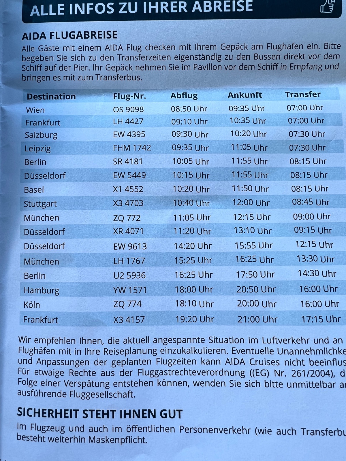 So, ein Update, heute, 9 Tage vor der Reise, ist der Rückflug hinzugefügt worden. Es ist wieder mit German Airways, also der Aida-Charter.