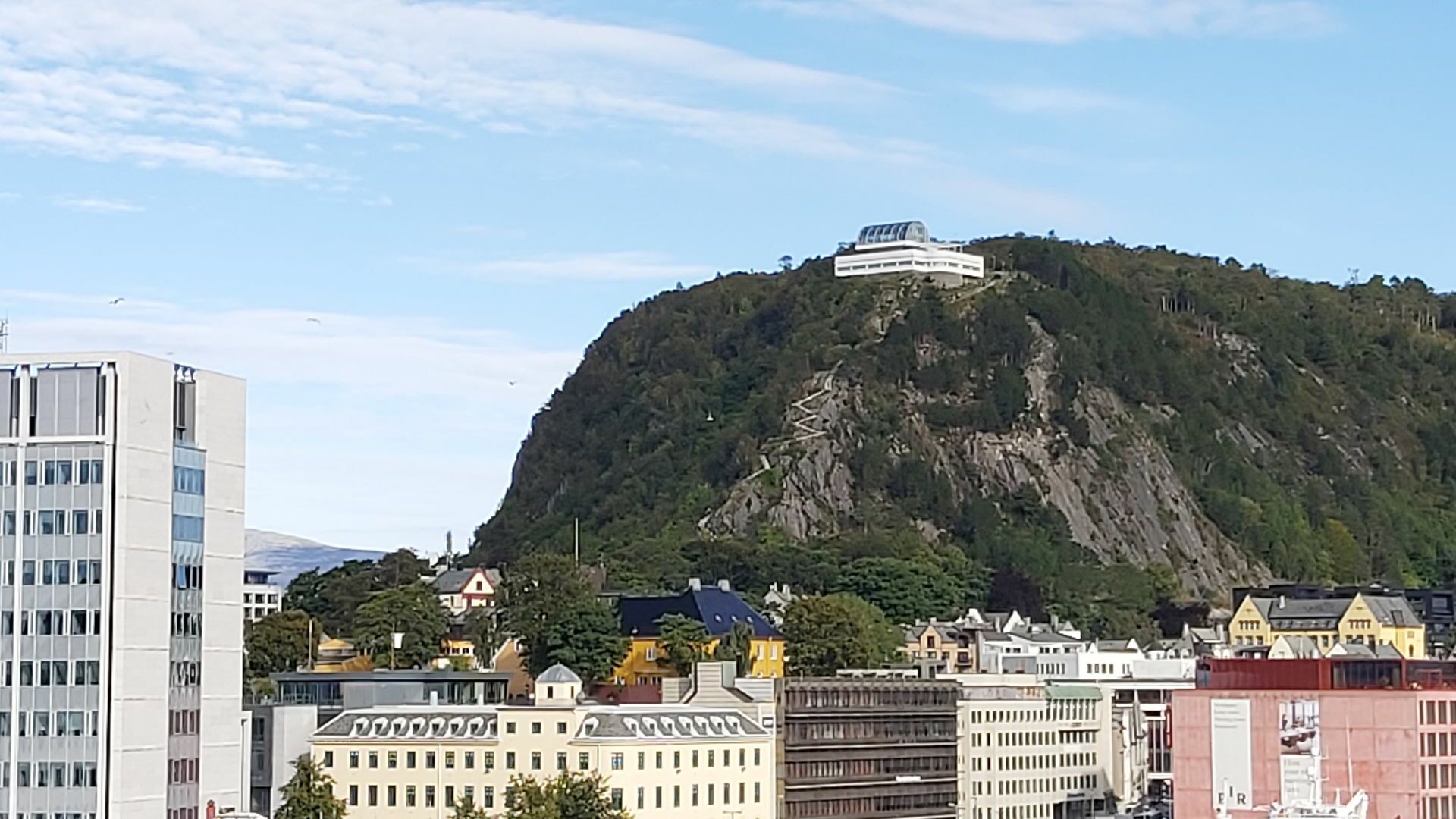 Wir waren Vorgestern in Alesund und sind auf den Hausberg Aksla gelaufen. Die 418 Stufen sind gut zu bewältigen. Vom Hafenausgang bis zum Restaurant oben haben wir 40 Minuten gebraucht....mit vielen Fotostopps. Das Tor zur Aussichtsplattform stand offen, Eintritt frei!