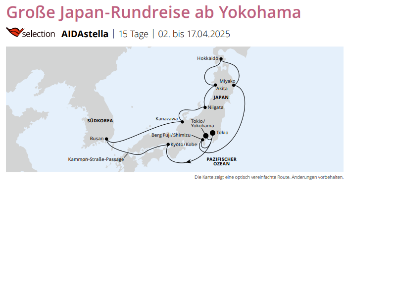 Die Shanghai nach Tokio Tour ist eine Highlight Tour, der Roundtrip ist eher eine spezielle Tour (wie ich oben schrieb - beide ohne die Insel Hokkaido - obwohl es auf dem Routenbild so aussieht).
