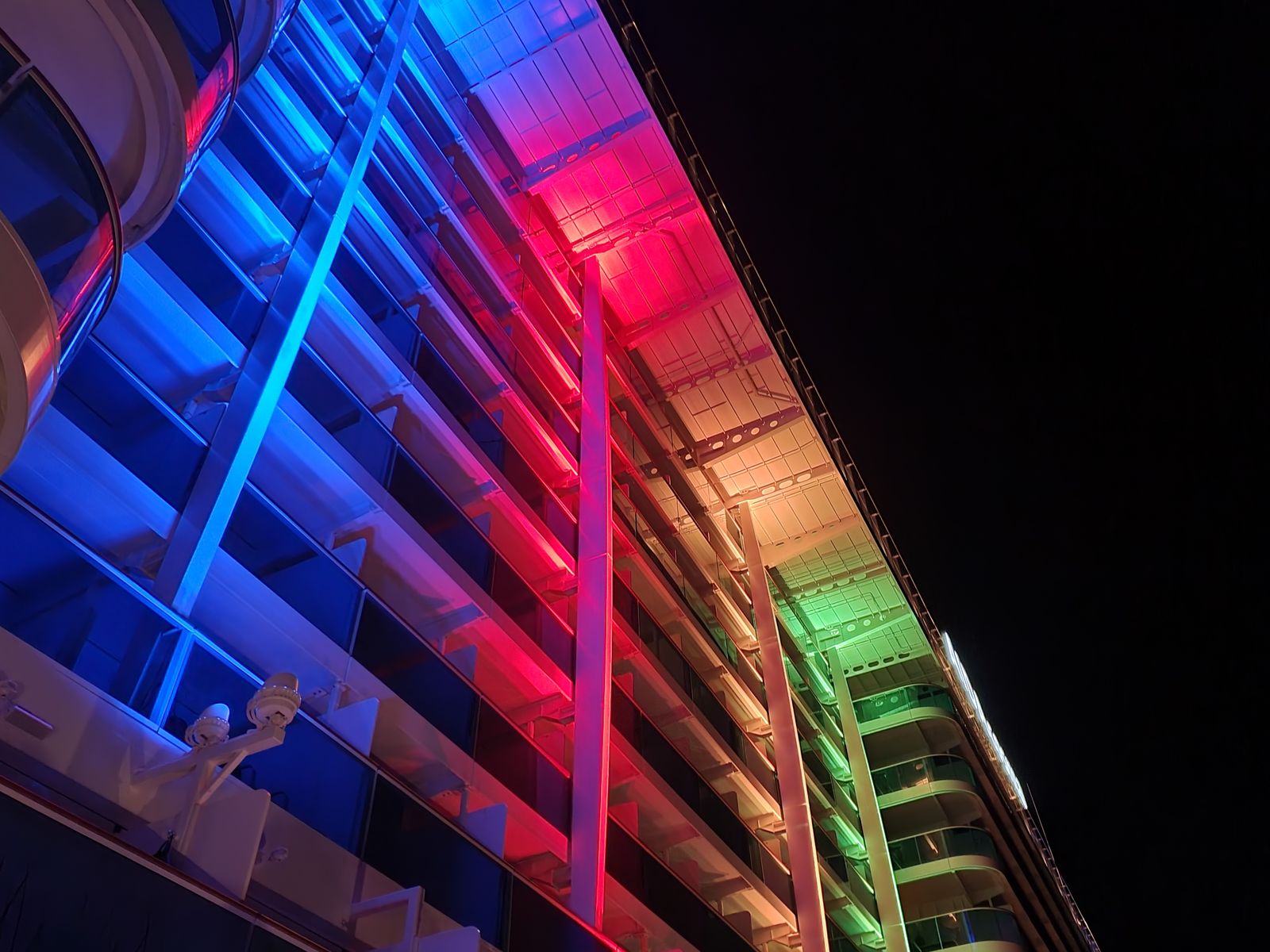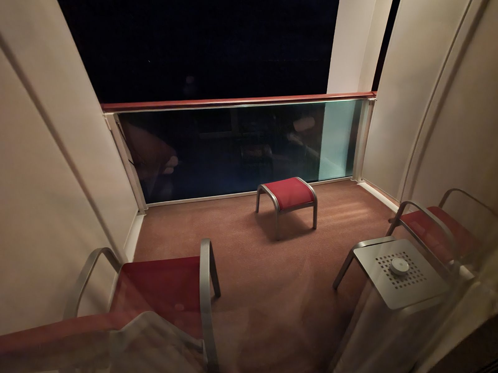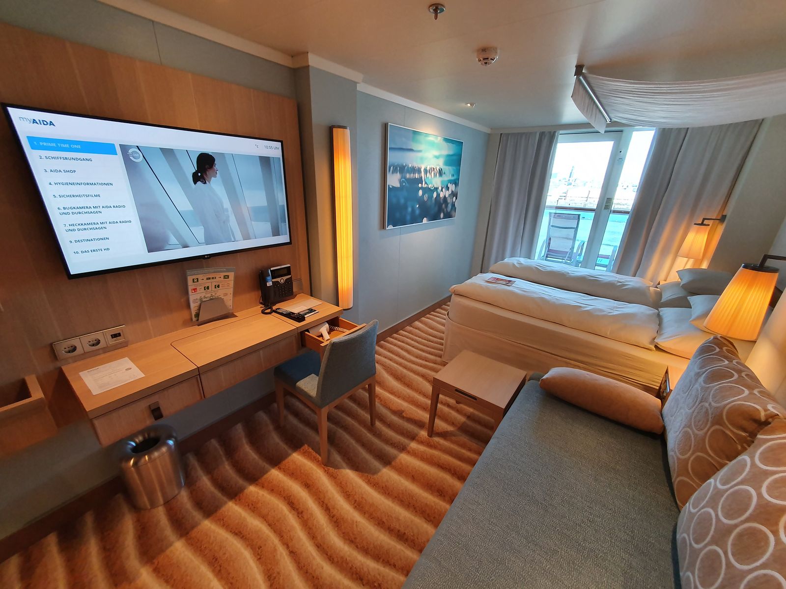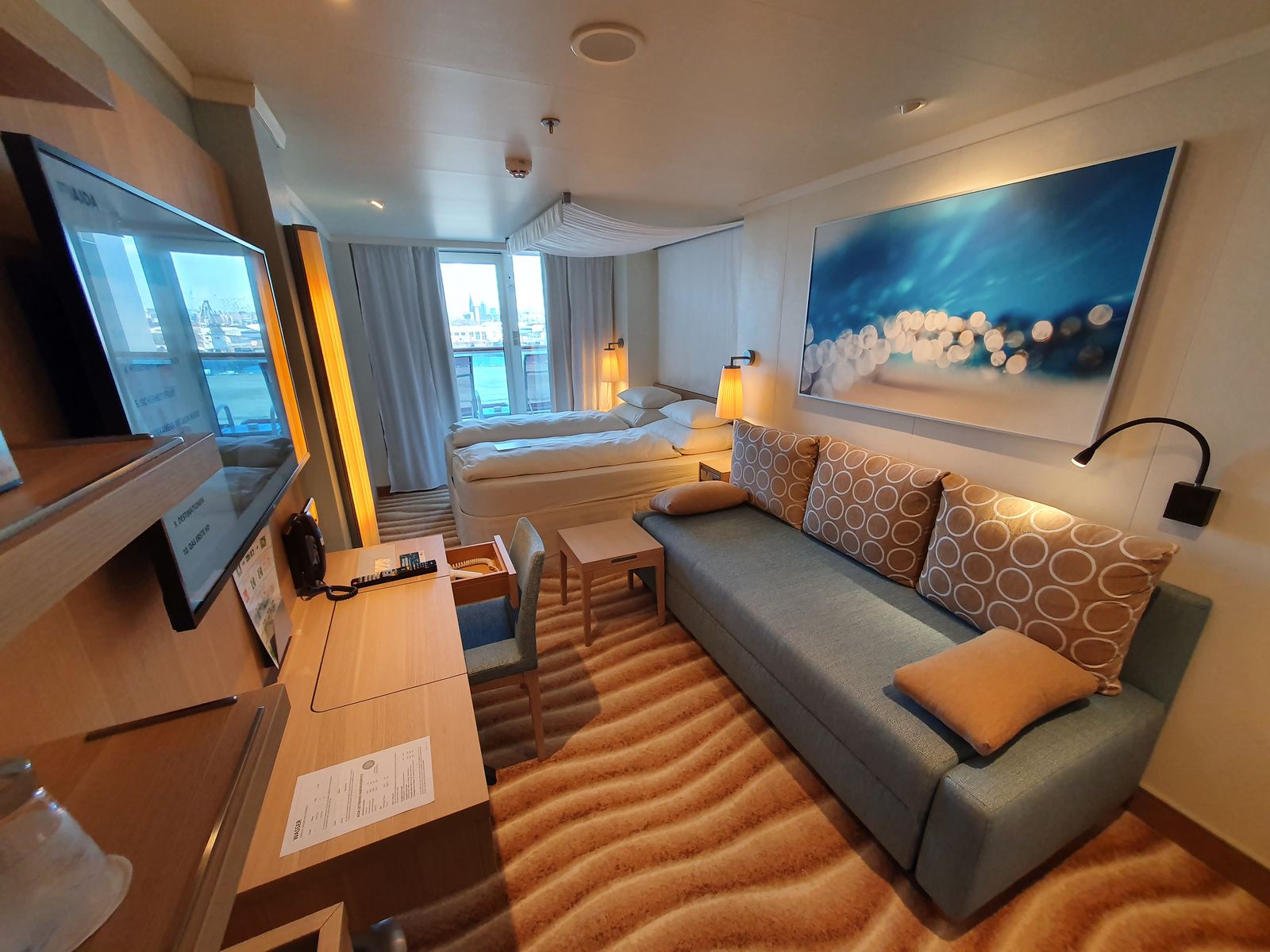 Verandakabine Komfort, im hinteren Bereich auf der Steuerbordseite. Viel Platz und ruhig gelegen, zwischen dem Fahrstuhl mittig und hinten, dadurch alles relativ schnell und einfach zu erreichen. Keine störenden Geräusche, einzig, und leider auch großer, negativer Punkt - die Beleuchtung des Schiffes. Abends erstahlt AIDAcosma in den typischen AIDA Farben, die Lichter werden nachts aber (bisher) leider nicht ausgeschaltet, somit ist der Balkon und auch die Kabine immer lichtdurchflutet. Wer, so wie ich, gerne mit offenen Vorhängen schläft, wird das hier leider nicht können, da es einfach zu hell ist - Bilder anbei.