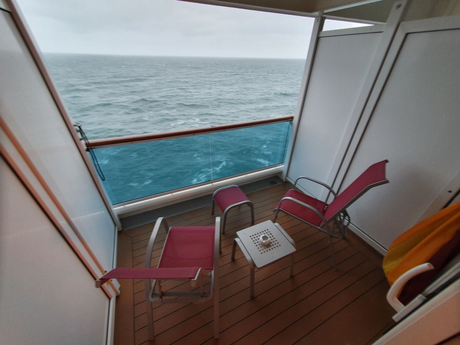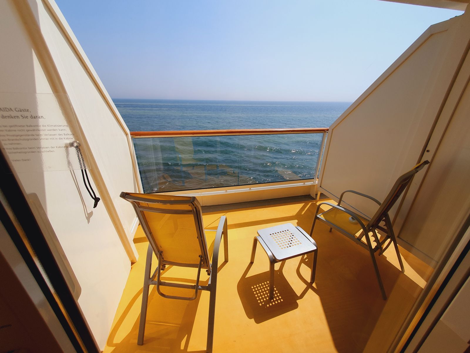 Wir hatten diese Kabine auf AIDAsol zugeteilt bekommen. Sie ist die 2. Balkonkabine von vorne auf der Steuerbordseite, dementsprechend sind die Wege auch sehr weit. Hatten bei der Zuteilung schon unsere Bedenken und auch während der (zu dem Zeitpunkt nötigen) Quarantänezeit von 90 Minuten konnten wir uns nicht mit der Kabine anfreunden. Ja, der Balkon ist größer als normal, allerdings wird er durch die "Biegung" des Schiffes zum Bug hin immer ein wenig kleiner. Der Blick direkt runter auf das Wasser war aufgrund der hohen und breiten Stahlbrüstung auch für uns große Menschen auf Zehenspitzen kaum möglich, zumal man sich durch das Wasser, welches sich unten an der Brüstung sammelte, nasse Füße holte. Im Sitzen konnten wir auch kaum etwas sehen, was vor allem für eine Fahrt durch die Schärenlandschaft schon sehr schade gewesen wäre. Glücklicherweise konnten wir Dank der geringen Auslastung noch in eine andere Kabine umziehen, was wir sehr zu schätzen wussten/wissen, das dies nun mal das Risiko einer Variobuchung ist. Falls noch interessant: die Betten stehen entgegen der Fahrtrichtung (Füße zum Heck). Vielleicht wäre die Kabine etwas als Meerblick-Upgrade..
