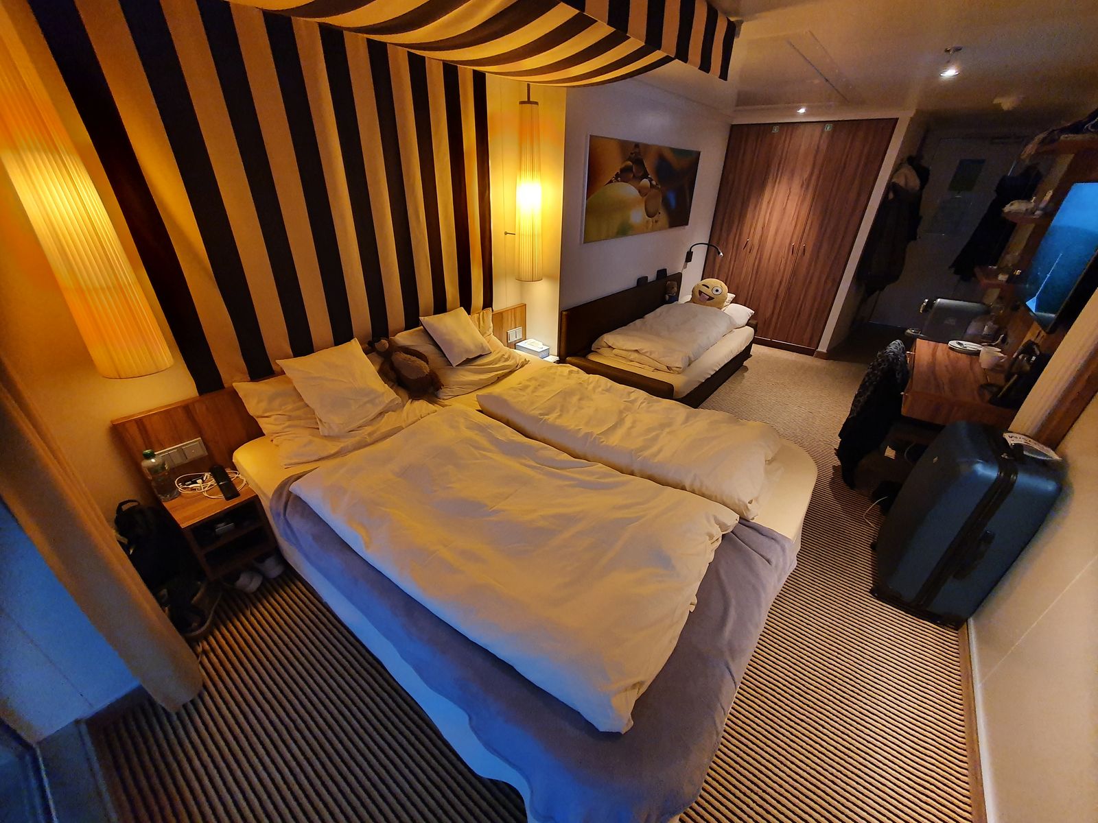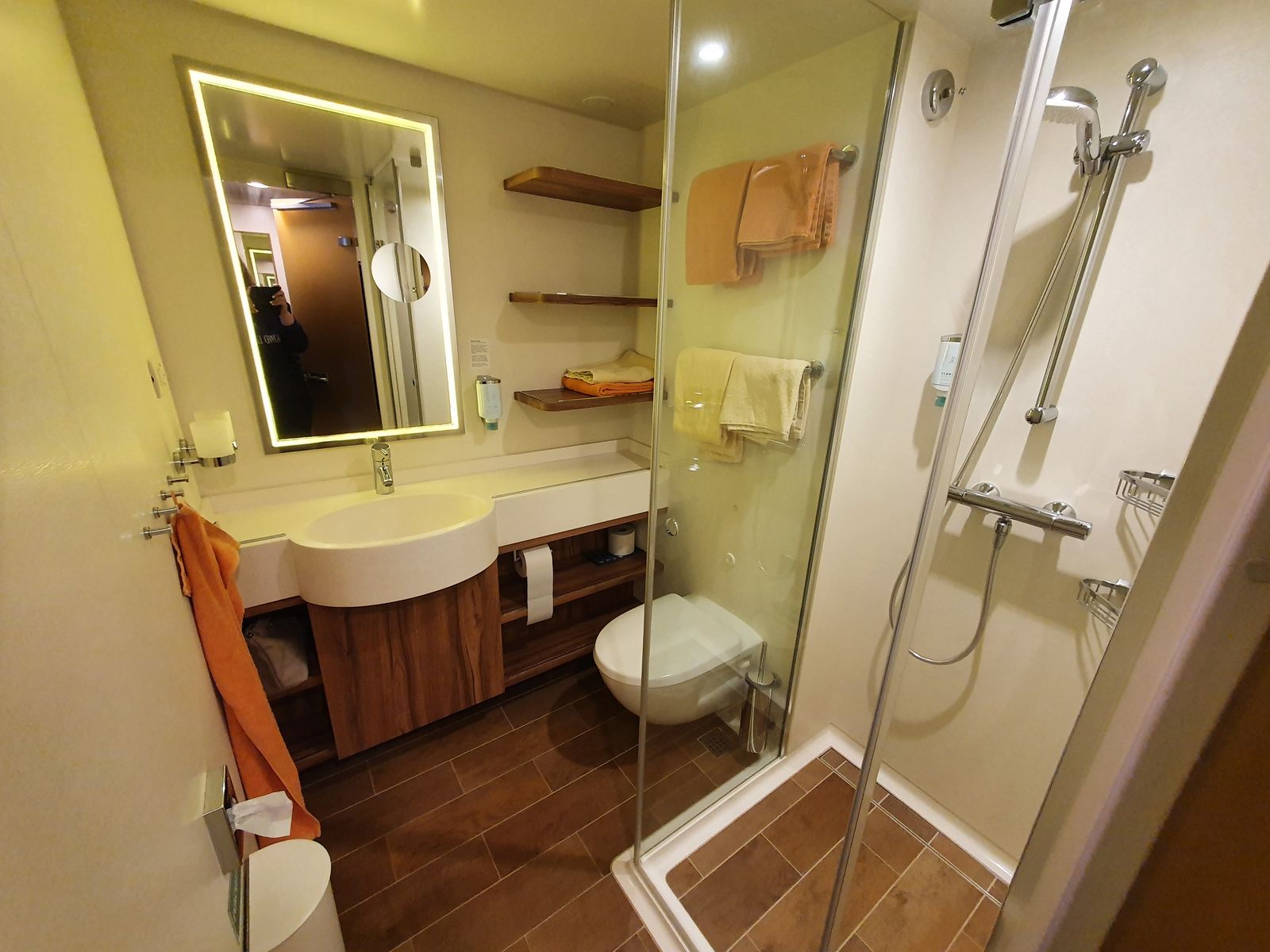 Was uns hier sehr positiv auffällt sind das geräumige Badezimmer, die vielen Ablagemöglichkeiten und der große Fernseher. Auch der Balkon ist schön groß - wie auf Deck 6 bei der Sphinx Baureihe. Durch die "Pfeiler" links und rechts muss man sich etwas nach vorne lehnen, um gut nach vorne/ hinten zu gucken. Allzu stark wird die Sicht dadurch aber nicht beeinträchtigt, zumal das bei so ziemlich jeder Kabine auf diesem Schiff der Fall ist.