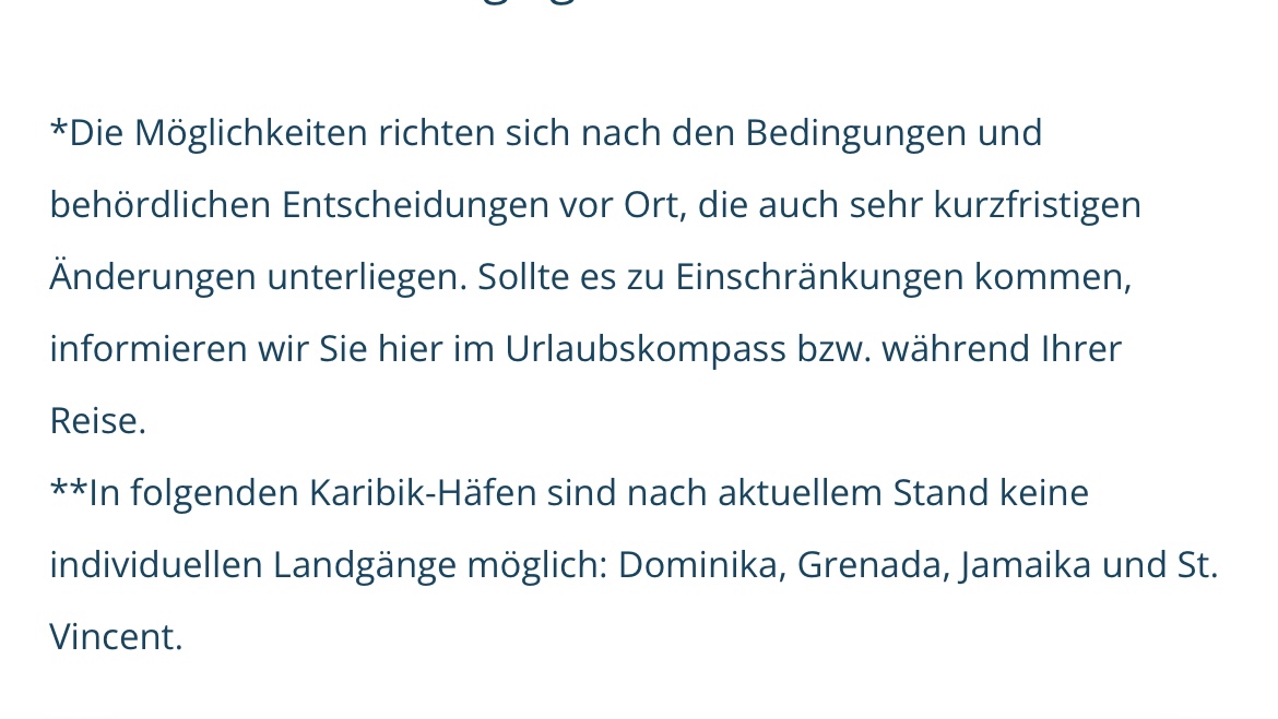 "Hallo Detlef, ja, das geht fast wöchentlich hin und her mit der Erlaubnis und der Untersagung individueller Touren seitens AIDA und so trauen sich die Gäste gar nicht mehr zu buchen oder verschieben gleich die Reise. Hoffen wir mal, dass die neueste Regelung von gestern nun bis Saisonende in 2 Monaten gilt.