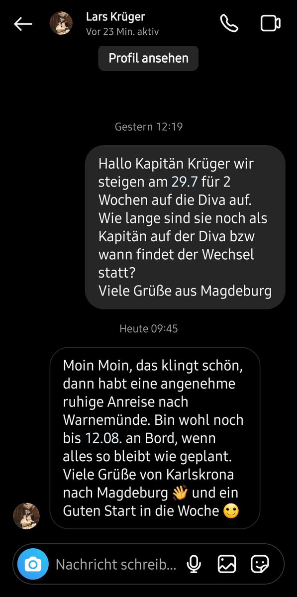 Hallo zusammen, ich habe Kapitän Krüger gestern bei Instagram gefragt wie lange an Bord ist.