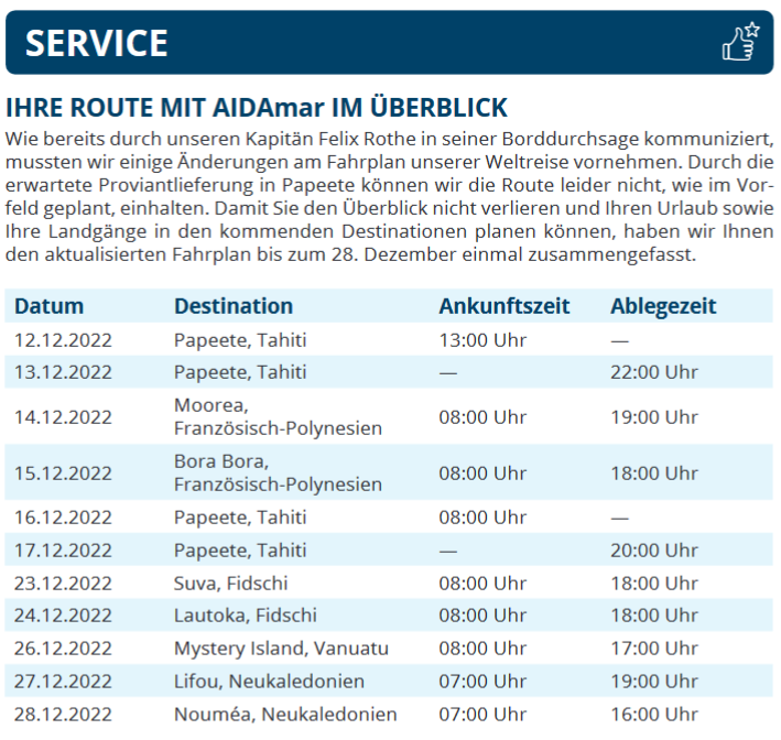Die Zeit zum Lesen all unserer Beschreibungen hat eine AIDAmar Mitarbeiterin auf 2 Stunden festgestellt.,
