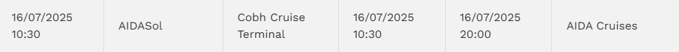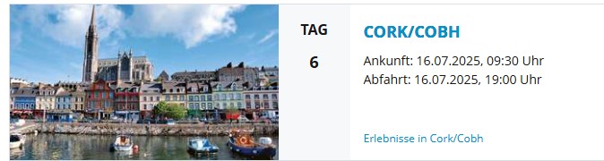 Mir ist aufgefallen, dass wir in Cobh um 10:30 Uhr anlegen und nicht um 9:30 Uhr wie die Website von AIDA anzeigt.
