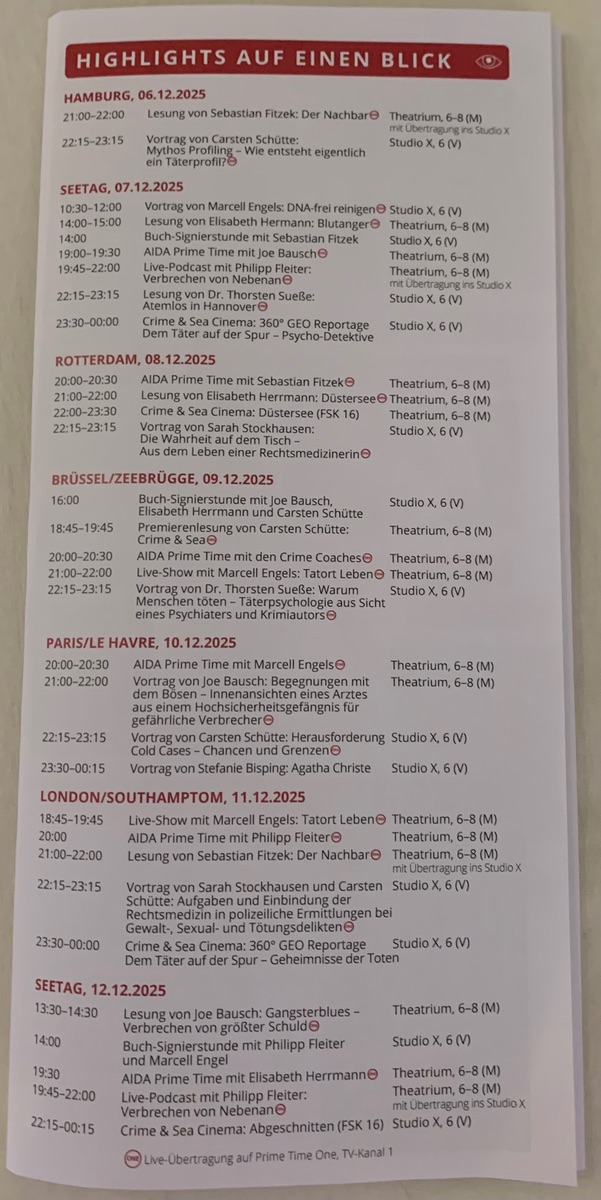 So hier der Nachtrag zu Freitag. Wir kamen um 20 Uhr vom Essen zurück und es war im Theatrium bereits so voll , dass man kaum durchgehen konnte. Wir haben uns die Lesung von Herrn Fitzek dann auf der Kabine angesehen. Veranstaltungen werden dann auch im Studio X übertragen aber wer nicht entsprechend früh da ist hat Pech. Am Sonntag am Seetag zur Signierstunde von 14:00 bis 19:00 Uhr brach dann das Chaos los. Bereits um 14:45 kam die Durchsage, dass wer sich jetzt noch anstellt es nicht mehr bis zum Herrn Fitzek schafft. Die Schlange war soooo lang das glaubt kein Mensch. Wir hatten besseres zu tun als ein paar Stunden rumzustehen