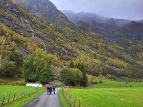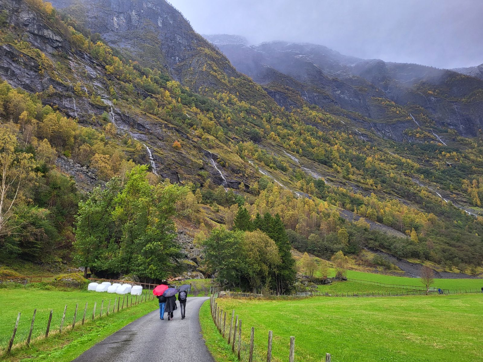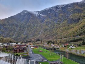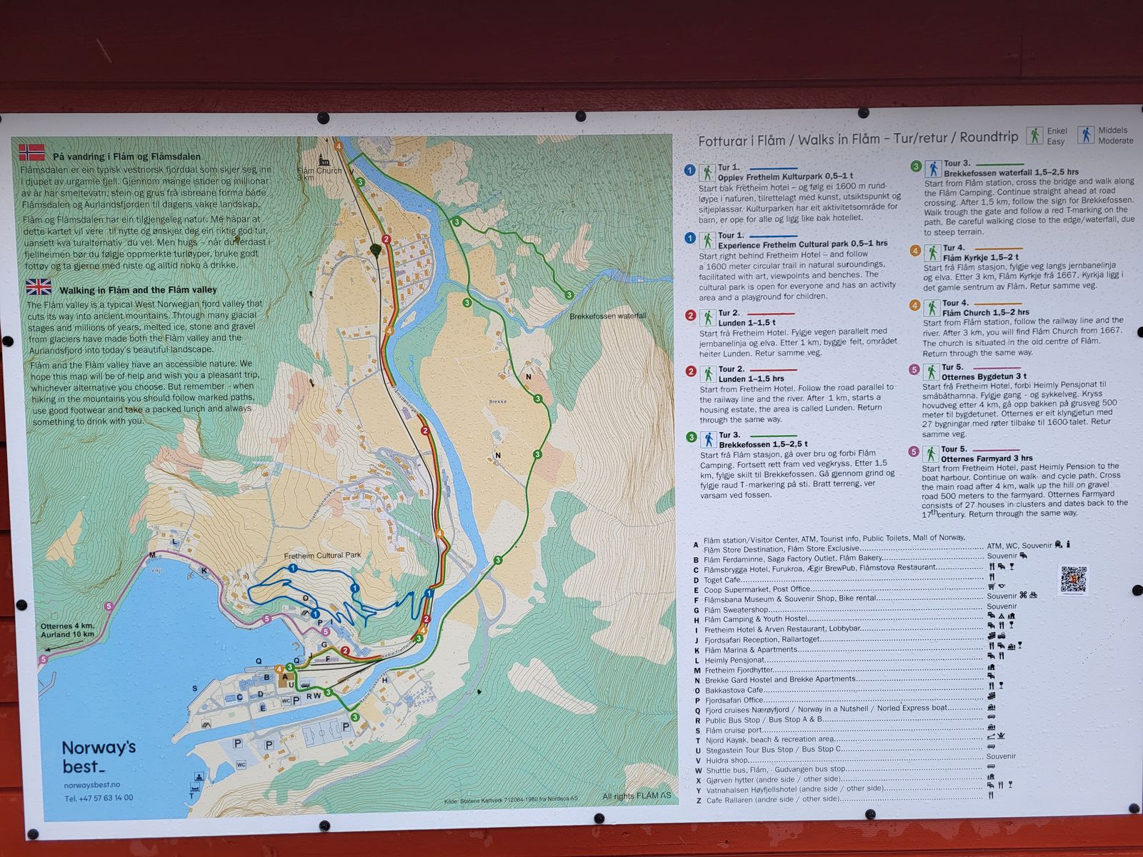 Wir waren durch ein Umroutung in Flam. Wir sind zum Brekkefossen (Wasserfall) gelaufen. Das ist die Tour 3 im nachfolgenden Plan. Mit Rollstuhl würde ich Dir empfehlen gleich rechts über die Brücke zu laufen. Wenn ich mich recht erinnere ist der Weg ausschließlich asphaltiert. Eventuell steigt der Weg gemächlich an. Auf jeden Fall ist die rechte Seite vom Schiff aus gesehen, die für mich schönere zum Laufen gewesen, weil man näher an den Wasserfällen ist und mitten in der Natur. Ihr könnt ja dann entscheiden, wann Ihr wieder umdreht. Ich stell Dir noch ein paar Fotos rein, vielleicht hilft das bei der Entscheidungsfindung. Ich wünsche Euch eine schöne Reise!
