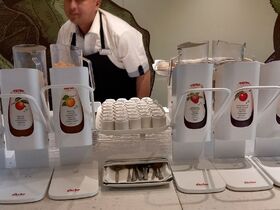 Der im Restaurant (rechts) ist nur für Gläser geeignet bzw. muss man in Flaschen umfüllen. Das ist auch der Saftspender beim Frühstück. Das ist dann super wenn ein Gast vor dir 5 Gläser runterlässt bis seine Flasche voll ist oder 10 wenn er die von seiner Frau auch gleich noch auffüllt