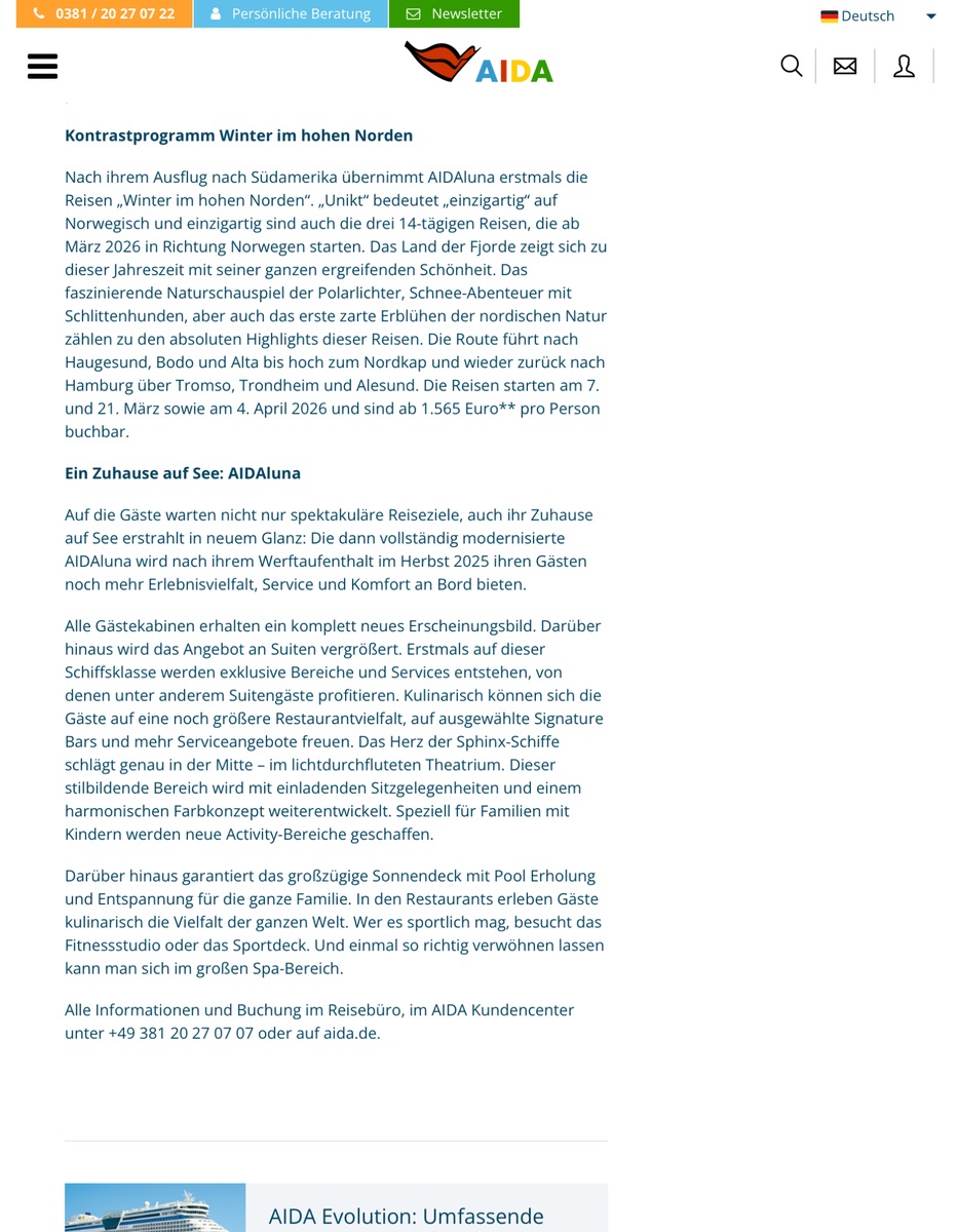 Wir hatten 14 Tage ab Dubai über Neujahr 25/26 mit der Prima ins Auge gefasst. Da unsere Umbuchung erstmal abgelehnt wurde und wir jetzt 24 Tage auf die Artania gehen und während der Tour, keine Lust haben uns über Aida zu ärgern, kümmern wir uns nach der Rückkehr um eine Umbuchung. Im Oktober sind wir mit der ganzen Familie, 14 Tage ab Korfu auf der AIDAblu. Passt genau in die Niedersachsen Herbstferien. Da freuen sich alle, wenn Oma u. Opa, sie einladen. AIDA hat sich nach der umgebuchten Fahrt, für uns erledigt.