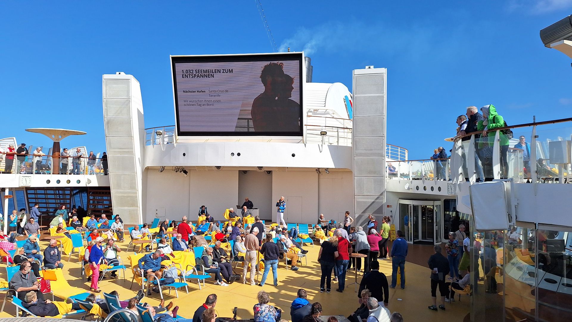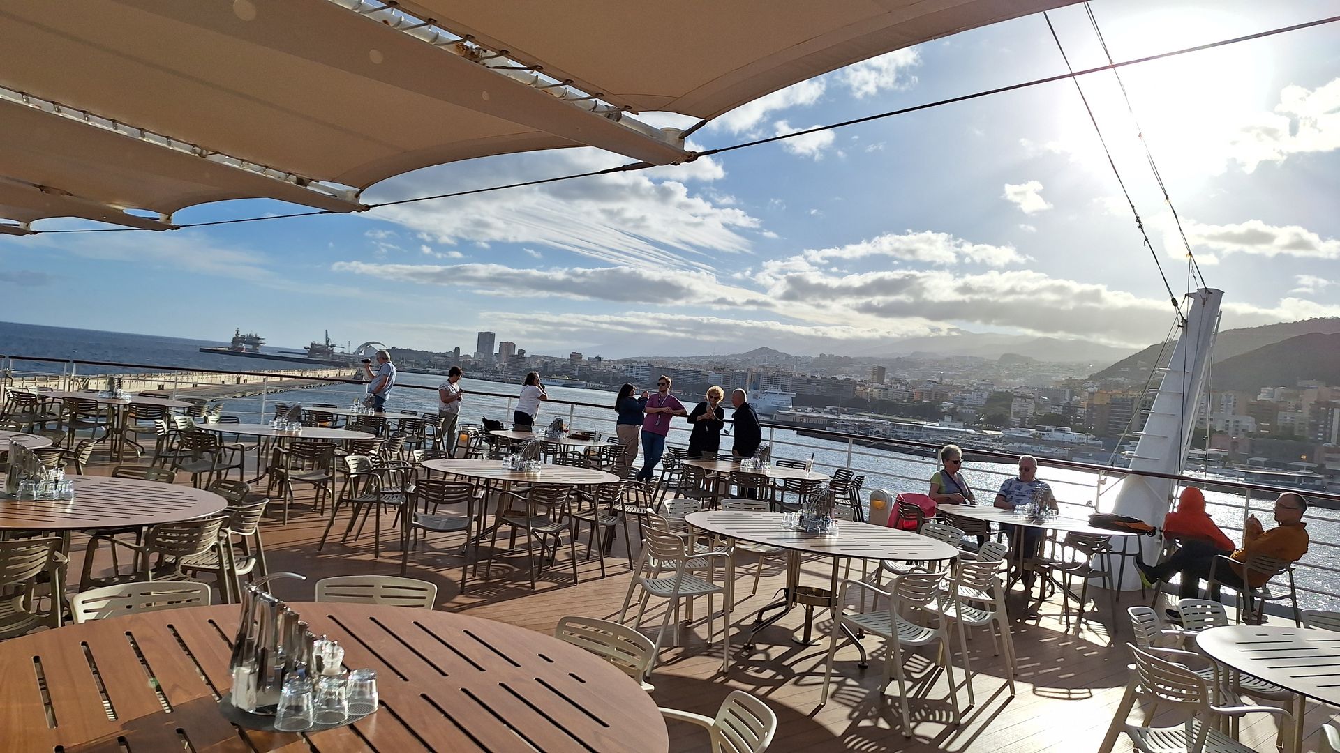 Dann das Auslaufen. Bester Platz im East. Und das Tollste: Normaler Urlaub endet bald, aber bei uns geht's jetzt erst richtig los. Sehr bewegender Moment. Morgen Santa Cruz de Teneriffa. Letzte Station vor der Überfahrt mit 5000 km bis St.Kitts. Wetter wird wieder schon. Wir freuen uns.