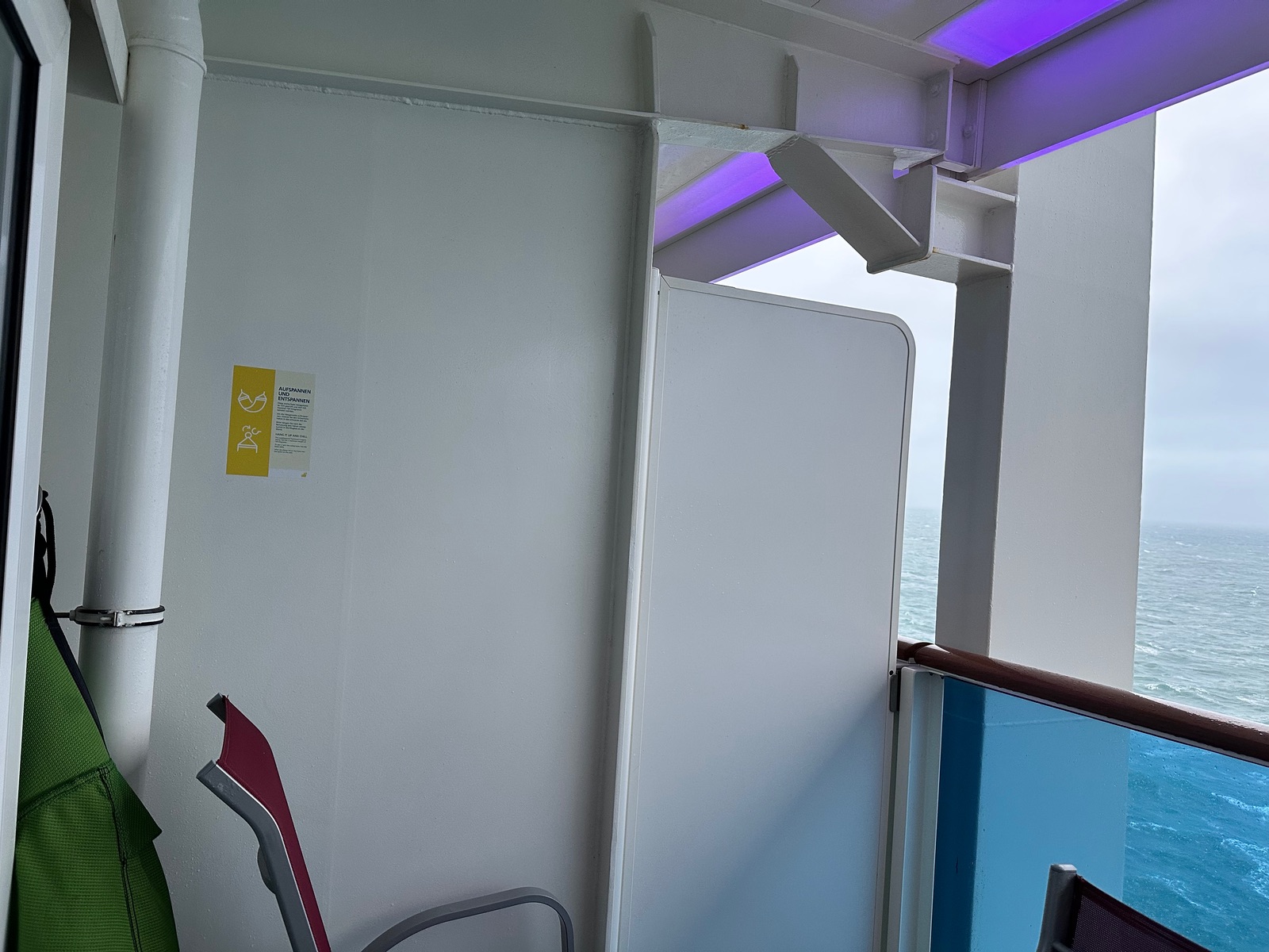 Der Dachüberstand von Deck 16 stört nicht. Allerdings ist ein Fallrohr auf dem Balkon. Das kann schon einmal leise glucksen. Auch befindet sich eine beleuchtete Säule auf dem Balkon und auch der Überstand wird nachts beleuchtet.