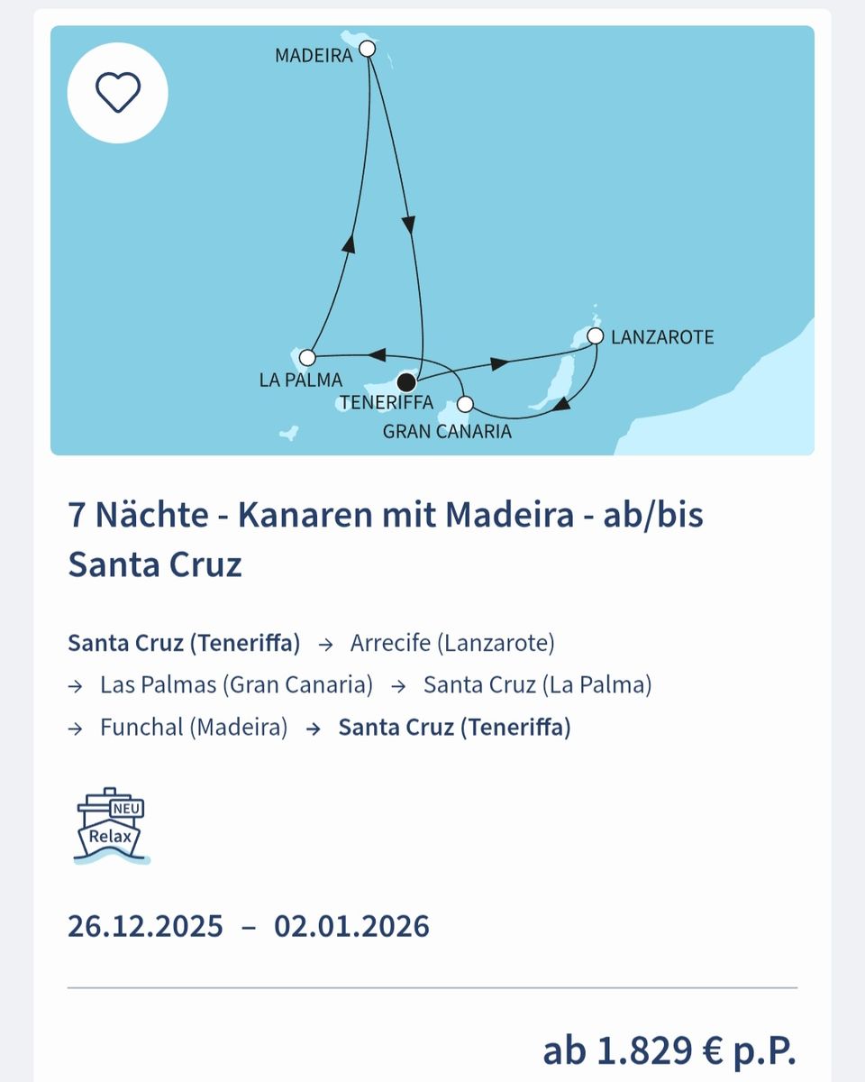 Es handelt sich um die 14 Tage Reise ohne Flüge, Premium ohne Allin, Balkonkabine für 2 Erwachsene und 1 Kind.