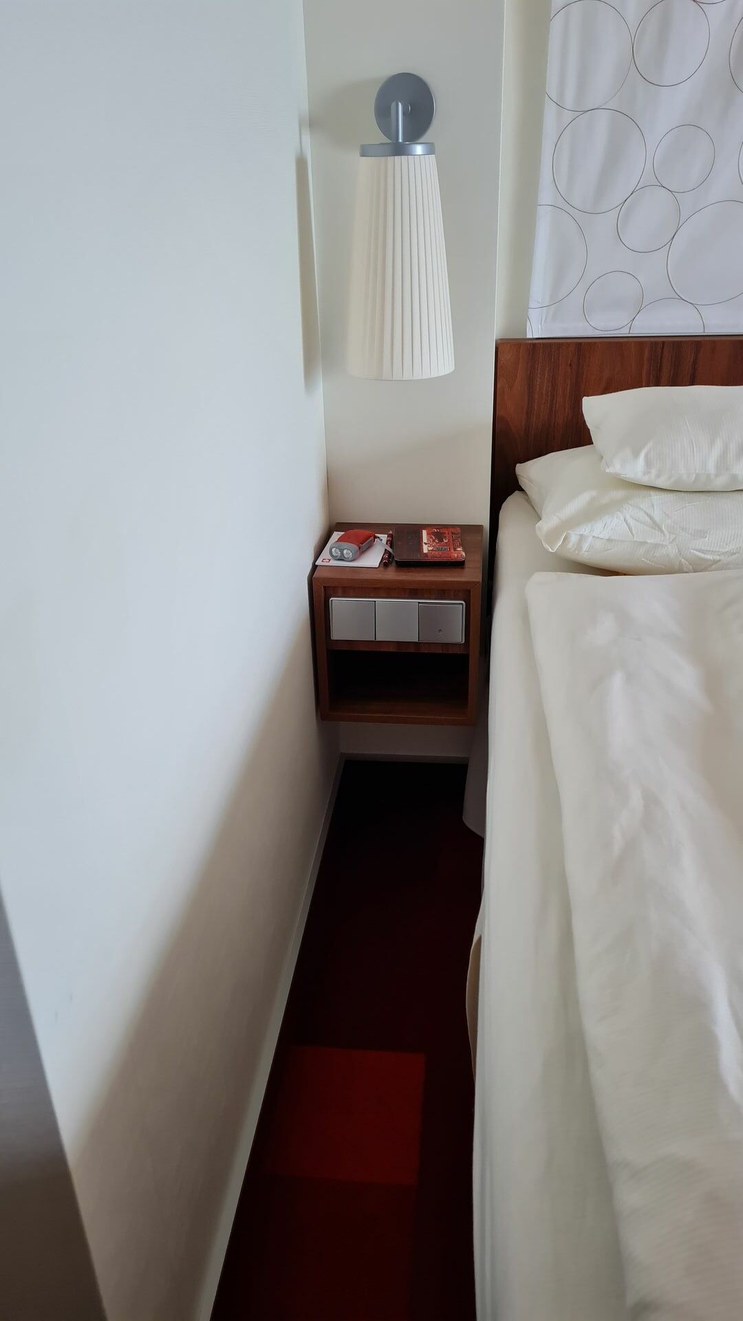 Man hört abends die Geräusche vom Lanaideck, wenn der Balkon offen ist. Hat einen begehbaren Kleiderschrank. Es kommt zuerst das Doppelbett, dann die Couch. Das Bett steht sehr nah an der Wand, sodass man kaum aufstehen kann. Kurze Wege zum hinteren Treppenhaus.