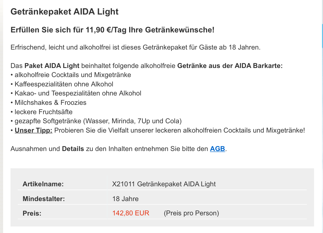 Mir wird gerade erst bewusst, dass der Preis für das Getränkepaket Aida-light nicht nur von 9,90 auf 11,90€ gestiegen ist, sondern dass man zukünftig auch noch einen Tag mehr bezahlen muss.