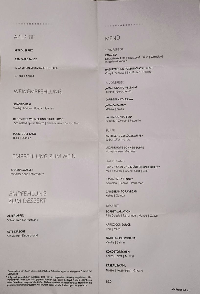 Gestern war die 1. Küchenparty im Rossini, wir waren nicht dabei, hab mir heute interessehalber die Karte geben lassen, hier steht 69,00 €, war im Bordportal allerdings mit 85,00 € buchbar, evtl. inkl. Getränke