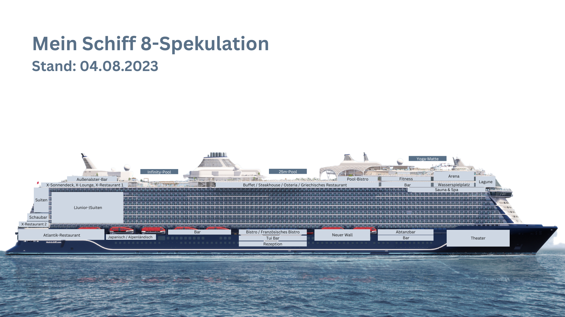 Fassmer hatte Ende Januar folgendes auf Social Media gepostet: „Unsere Luxus-Tender & Rettungsboote wurden abgenommen! Bald geht’s für sie zur Werft nach Frankreich!“ Schauen wir mal, ob es diese Rettungsboote sind und ob sie für die Diva sind… zumindest wurde zwischenzeitlich bei den Rettungsbooten vor Ort der Schriftzug neu gestrichen, wäre bei einem Kompletttausch nicht zwingend notwendig gewesen… (Bildquelle: Fassmer Facebook
