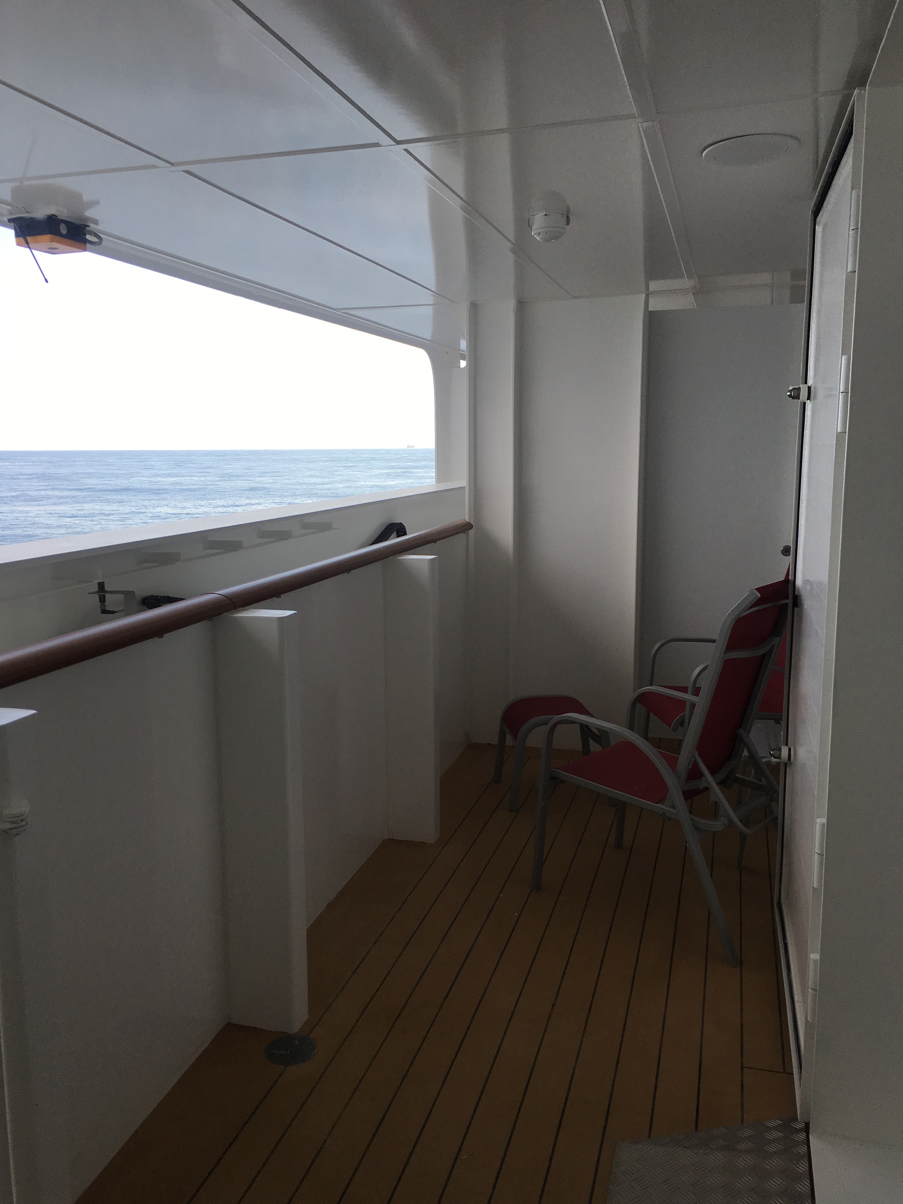Das ist richtig, dass die Kabine im Katalog mit Stahlbalkon gekennzeichnet ist. Allerdings ist die Balkonbrüstung hier tatsächlich noch ein ganzes Stück höher als normal. Auf dem Foto von mir sieht man, dass vor der eigentlichen Brüstung mit Holzabschluss noch eine Art Blech davorgesetzt ist, das ca. 15 cm noch darüber hinaus ragt. Weiterhin befindet sich auf der linken Balkonseite eine Art Ladearm o. ä. der die Sicht etwas einschränkt. Dies fanden wir nicht so schlimm, da der Balkon an sich sehr breit ist. Störend war tatsächlich die doch überdurchschnittlich hohe Stahlbrüstung.