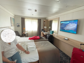 Ich habe jetzt meine Kabinenzuteilung bekommen. Als Alleinreisende eine Doppelkabine auf Deck 2 ziemlich mittig mit großem runden Fenster. Ich freue mich.🍾