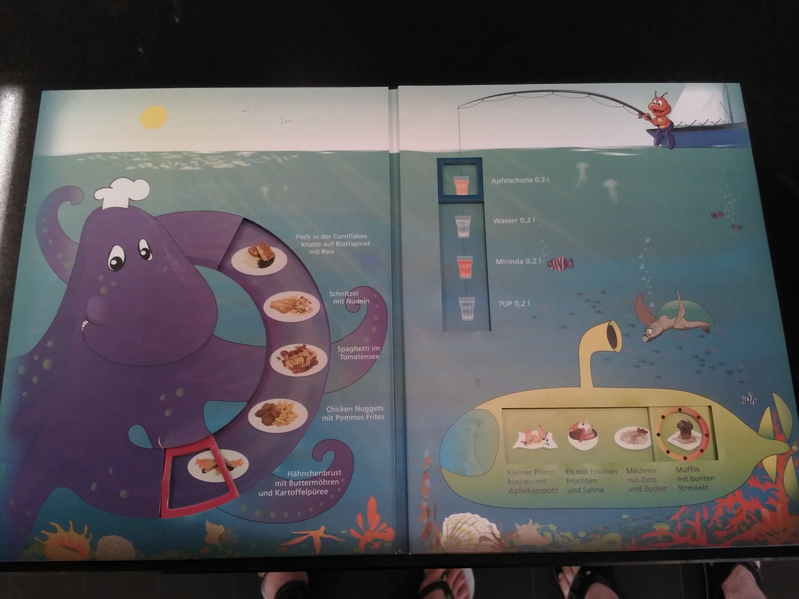 Ich hatte vor einiger Zeit gelesen, dass es auf der Prima für die Kinder eine spezielle Kinderspeisekarte in den A la Carte Restaurants (also z.B. French Kiss, Tapas Bar, Brauhaus, etc.) geben soll, ein "Tiefseetaucher Menü".