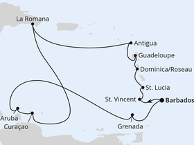 Routenverlauf: Bridgetown – Kingstown – Castries – Roseau – Pointe-À-Pitre – St. John's – Erholung auf See – La Romana – Erholung auf See – Willemstad – Willemstad – Oranjestad – Erholung auf See – St. George's – Bridgetown