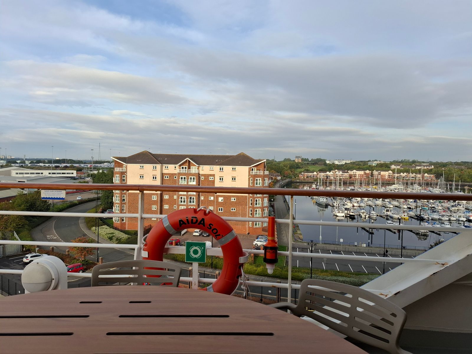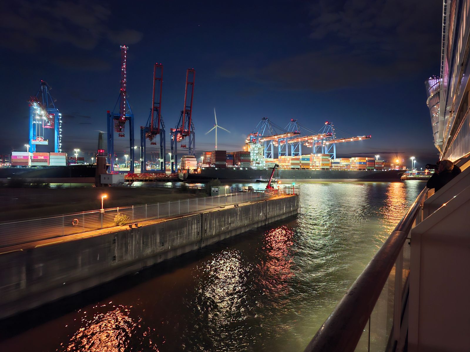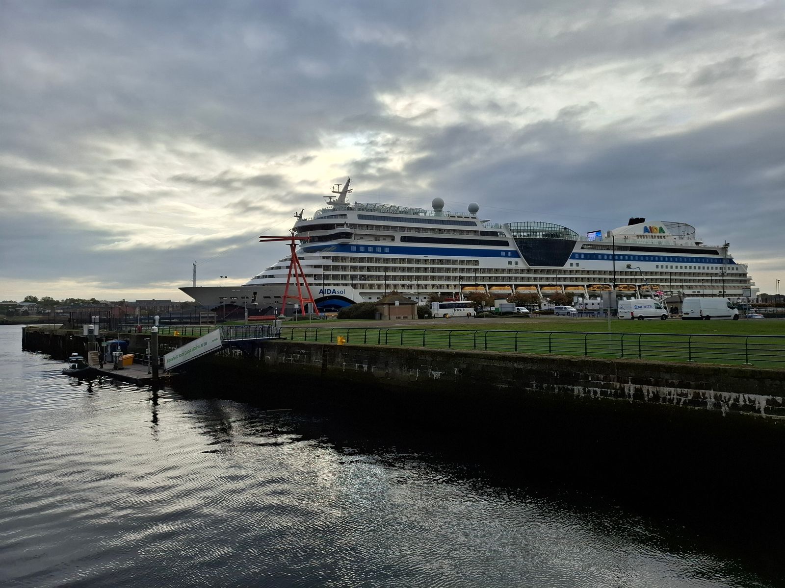 Beste Grüße von AIDAmar (hat wohl ein bisschen später als geplant erst gegen 07:00 Uhr heute Morgen in Steinwerder festgemacht)!