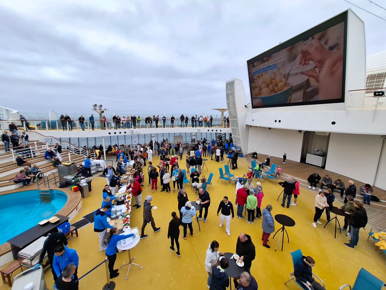 1) Während der Frühstückszeit ist es wegen einem medizinischen Notfalls zu einem weiteren Hubschraubereinsatz auf dieser Reise gekommen. Bevor die erste offizielle allgemeine Durchsage durch den Kapitän erfolgte, ist die Crew wirklich wie Ameisen auf Deck 12 und 14 ausgeschwärmt (gefühlt jeder , der irgendwie in seiner eigentlichen Funktion - z.Bsp. Kellner -zu entbehren war), um Liegen, Stühle etc. schnellstmöglich wegzuräumen. Das war beeindruckend und verdient ein großes Lob an die Besatzung!!!