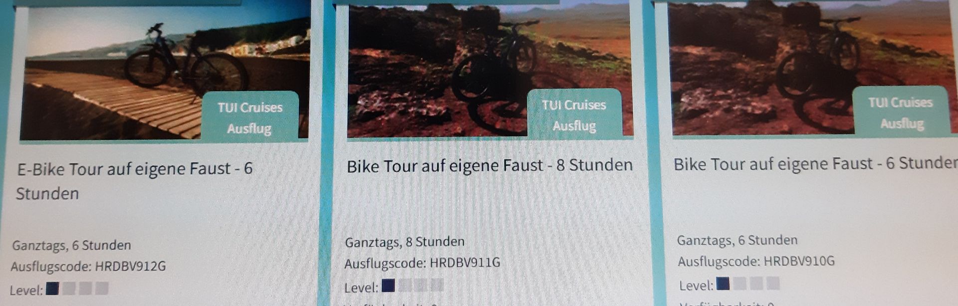 Fahren jetzt im September mit Mein Schiff. Bei der Ausflugsplanung ist mir aufgefallen, dass Tui Aktiv Touren mit dem Bike anbietet ("richtige" Räder