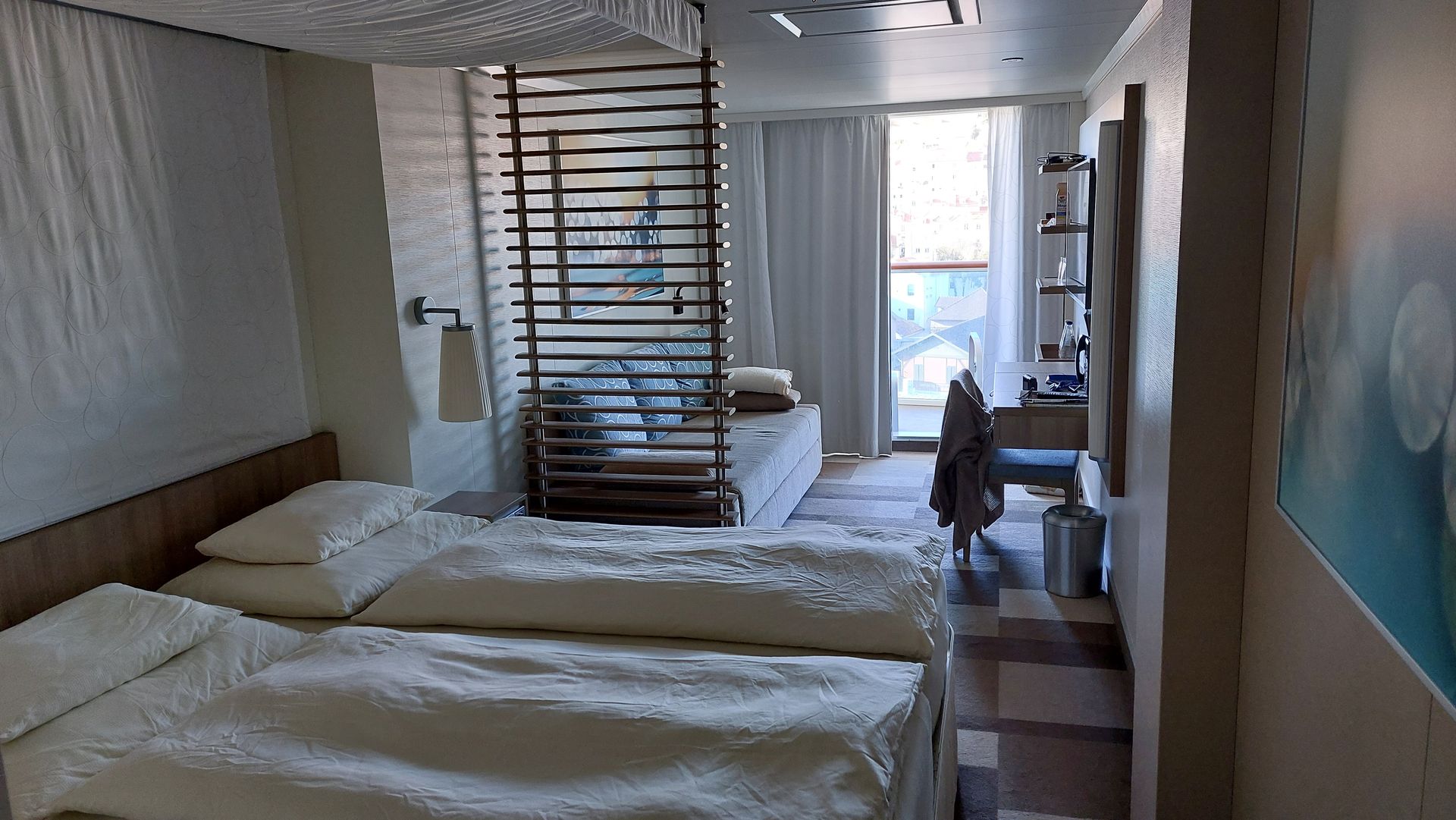 Vor allem das zwischen Bett und Wand so viel Platz war, im Gegensatz zu anderen Kabinen, fanden wir gut. Auch die Aufteilung der Kabine, also das das Sofa optisch durch einen schmalen Wandteiler vom Bett abgetrennt war, fanden wir toll. Und die Größe des Balkons war für uns auch groß genug. Haben der größere Veranda, die wir zuvor schon auf der Cosma und Nova bei Verandakabinen hatten nicht vermisst.Vom Balkon hat man eine wunderbare Aussicht, es gibt keine Sichteinschränkungen und auch Nachts keine störenden Lichter.