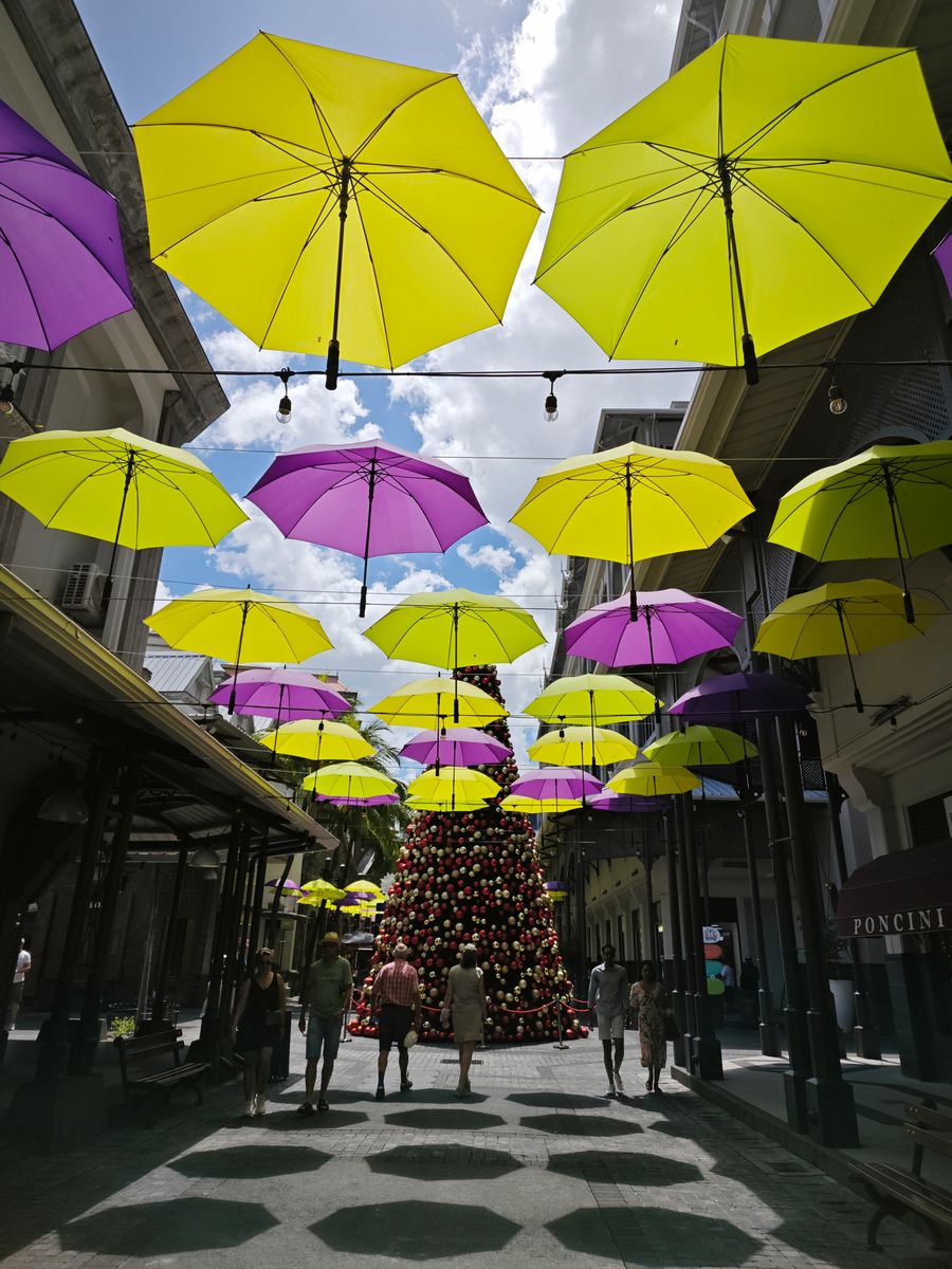 Nach dem Ausflug sind wir um ca. 09:00 Uhr an Bord gegangen und haben das Frühstück gemütlich genossen. Anschliessend sind wir in die Stadt haben den Weihnachtsbaum und die Regenschirme bestaunt und sind zurück zum Schiff. Man geht ca. 15 min. bis zu den Regenschirmen. Beim Schiff links da ist der Fussgänger Weg und Beschriftung in die City. Man kommt hier bei einem Aqua Park vorbei, da über die Brücke und dann immer gerade aus, beim Museum "Blaue Mauritius" vorbei und dann noch gerade aus und man sieht schon die Regenschirm Strasse.