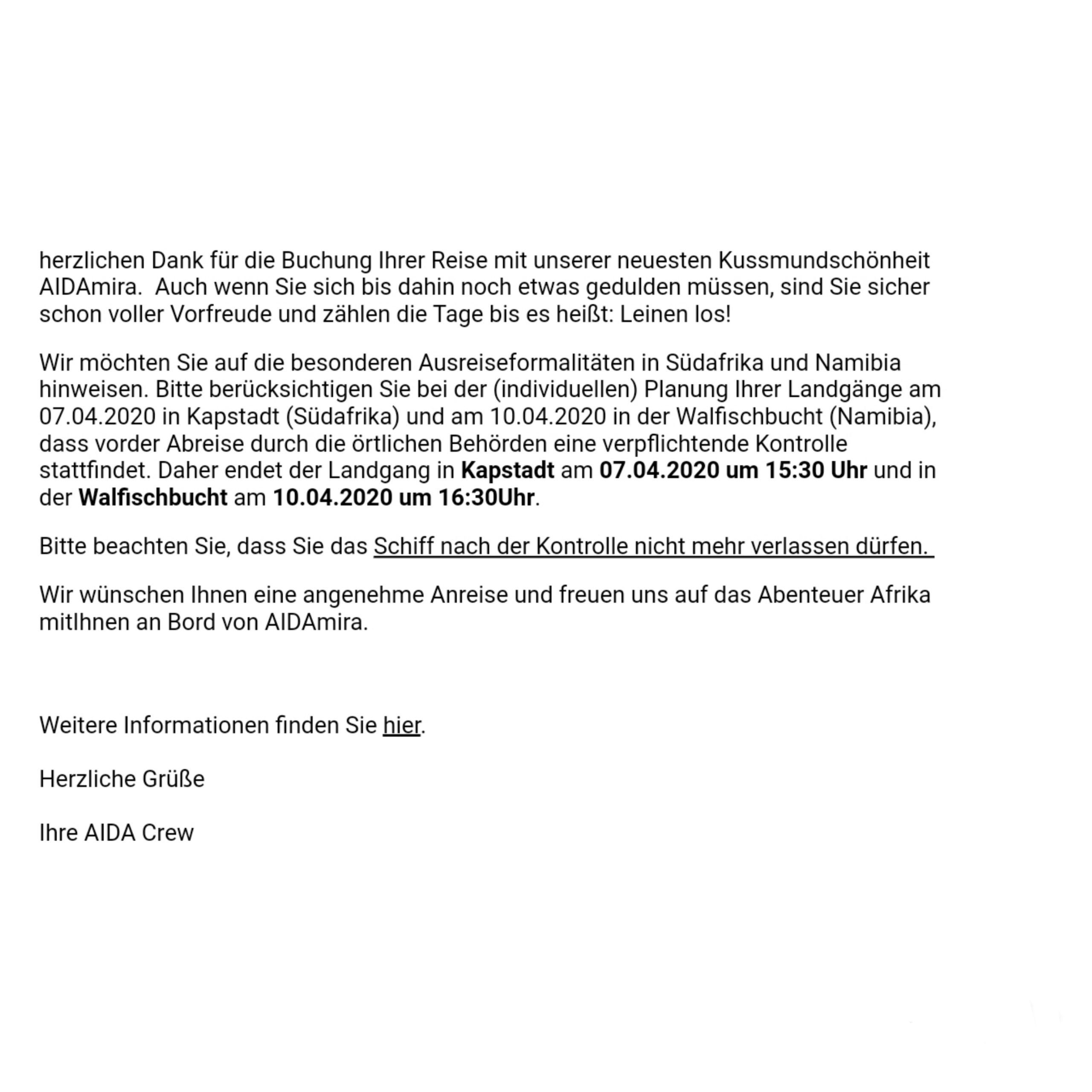 Anbei ein Auszug der Mail von Aida.