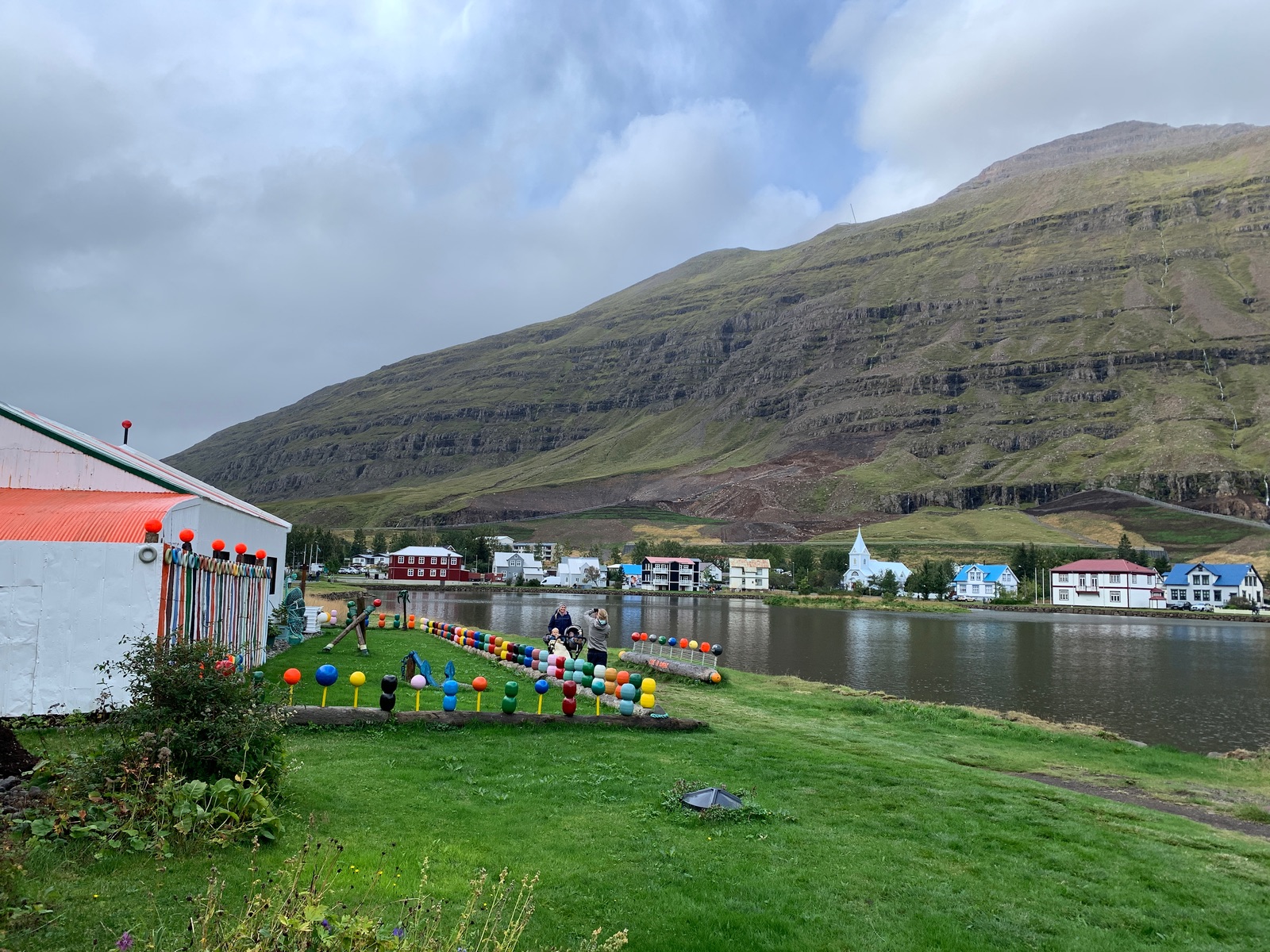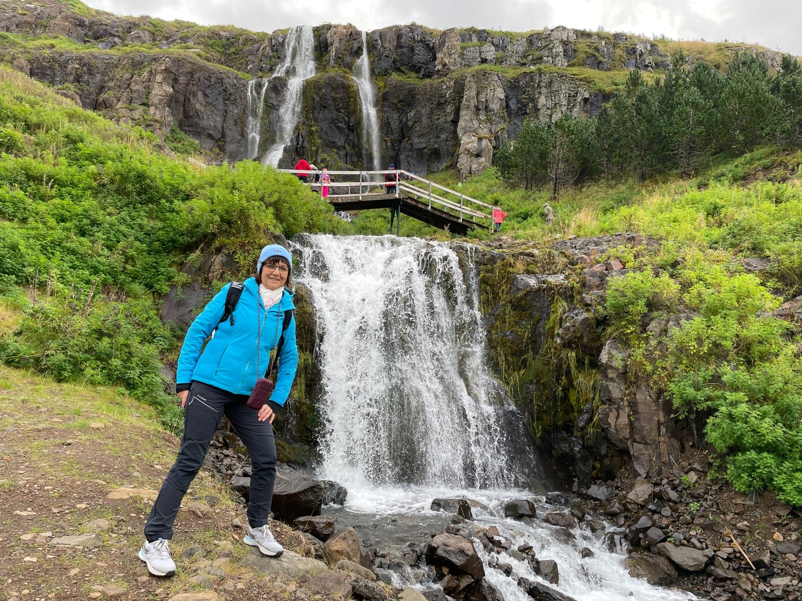 In der Touri- Info bekam man Stadtpläne und Hinweise zu Spaziergängen. Wir sind erst zum Wasserfall gelaufen den man schon vom Schiff aus sieht… eigentlich zum Greifen nah. Wir erklimmen den Berg bis zur Brücke und trauen uns noch etwas höher. Man hat von dort oben einen tollen Blick auf den Ort, das Schiff und die Umgebung des Fjordes.