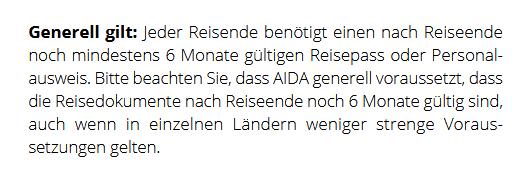 In den allgemeinen Einreisebestimmungen von AIDA steht folgendes: