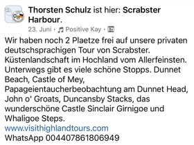 Scrapster? Nie davon gehört, auch die Karte sagt wenig, ausser, dass es wohl sehr klein ist (um die 100 Einwohner, wie wir jetzt wissen 😁). Die Begeisterung hielt sich in Grenzen, wir waren einfach gespannt. Plan war eigentlich, sich einfach durch die Gegend treiben zu lassen und vielleicht das recht leere Schiff zu geniessen. Bis in der Facebookgruppe ein Aufruf von Visithighlandtours war, dass auf einem ihrer Ausflüge noch Plätze frei waren. Man fährt mit dem Minibus verschiedene Plätze an, die grosse Reisebusse teilweise gar nicht anfahren können. Unter anderem die Whaligoe Steps mit ihren 300 Stufen runter (und dann wieder hoch 🙈) waren sehr beeindruckend.