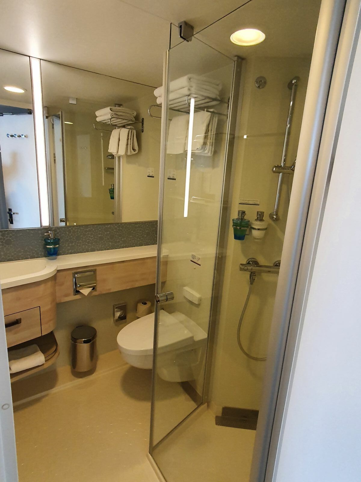 Das Bad ist sehr geräumig und ich finde die Gestaltung doch etwas ansprechender als in den Balkonkabinen.