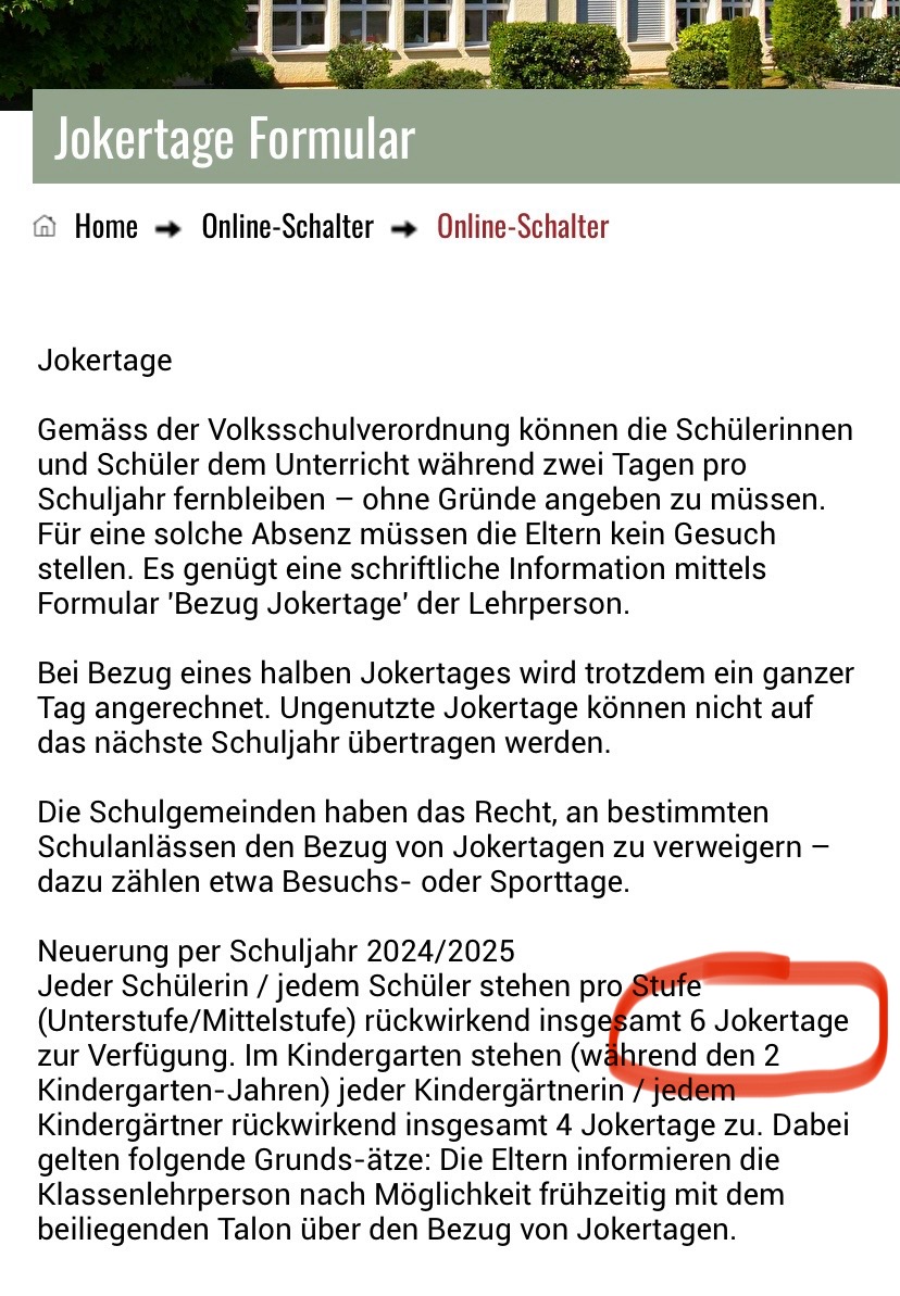 Vllt. eine Erklärung: In der Schweiz haben Eltern 5 sogenannte Jokertage. Man kann sie Zusammenhängend oder einzeln nehmen.