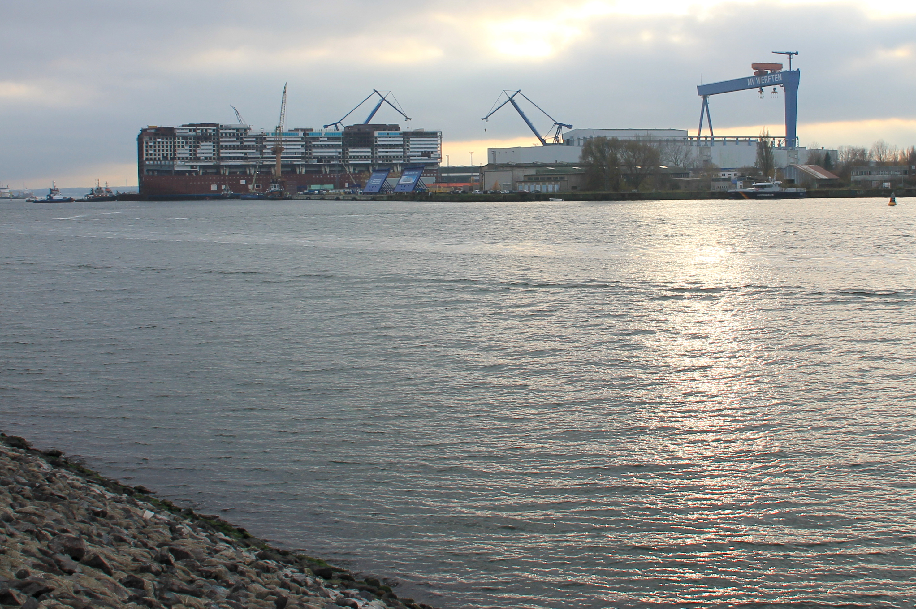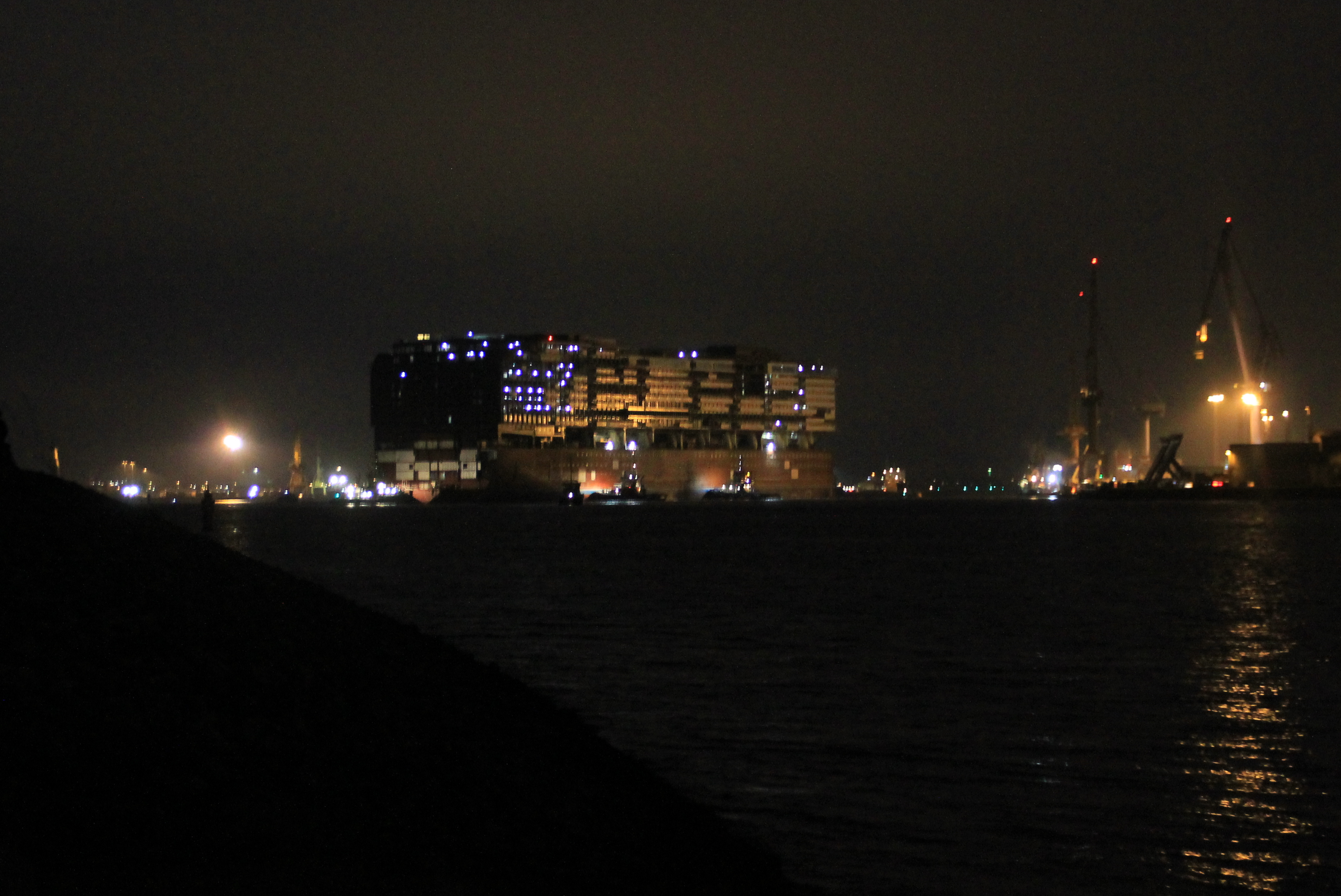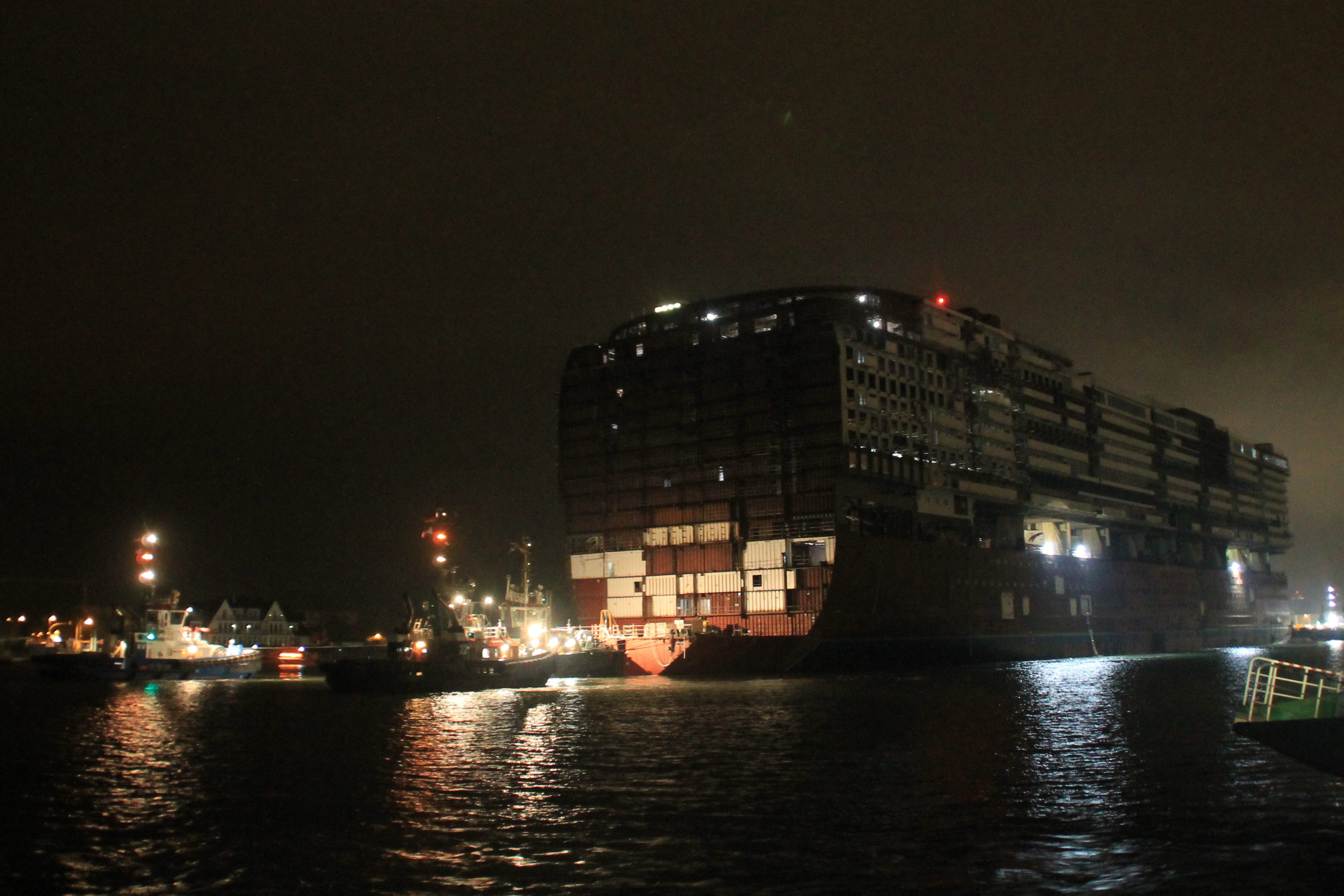 Mittlerweile bin ich auch wieder aufgetaut - es war schon eine Herausforderung, so lange auszuhalten.... Das ganze Manöver hat sich um bestimmt zwei Stunden verzögert, teilweise bewegte sich das Ding über lange Zeit keinen Millimeter... Von einer in unserer Nähe stehenden Frau erfuhren wir, dass es Komplikationen gab, da war wohl irgendwie ein Seil gerissen (ihr Sohn war an der Ausdockung beteiligt). Dann mussten wieder die Fähren durchgelassen werden, ein Tanker musste durch und und und... Und immer wenn wir schon gehen wollten, war doch wieder Bewegung zu sehen.
