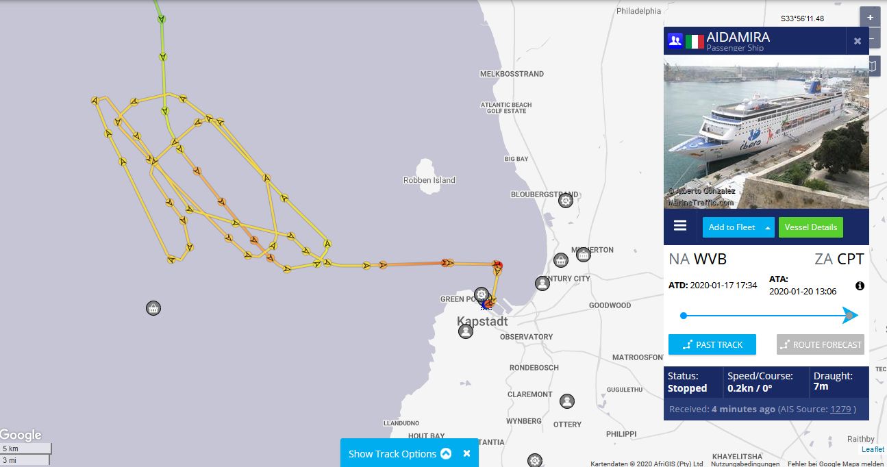 man sollte aber bedenken, dass fast alle Reedereien die Route über den indischen Ozean, Kap der guten Hoffnung, Kapstadt befahren, d.h. mit der Meeresströmung. Die Mira fährt aber von Kapstadt Richtung Durban die entgegengesetzte Richtung, also gegen die Strömung.