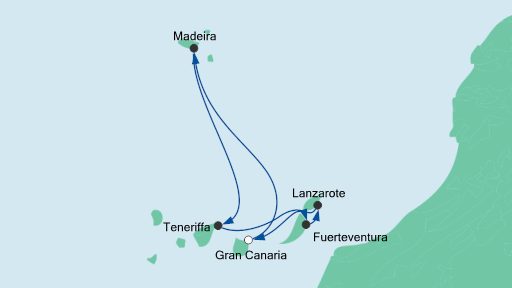 Route Kanaren ( GranCanaria-Lanzarote-Fuerteventura-Madeira-Teneriffa ), inkl. Flug ab Düsseldorfnach Gran Canaria und zurück.