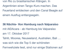 Mein Mann und ich hoffen auf Teilstrecken der Weltreise mit der Aura nächstes Jahr. Hat vielleicht irgendjemand schon was läuten hören, wann das sein könnte. LGIch habe soeben eine E-Mail bekommen, das jetzt Teilstrecken der Weltreise gebucht werden können .