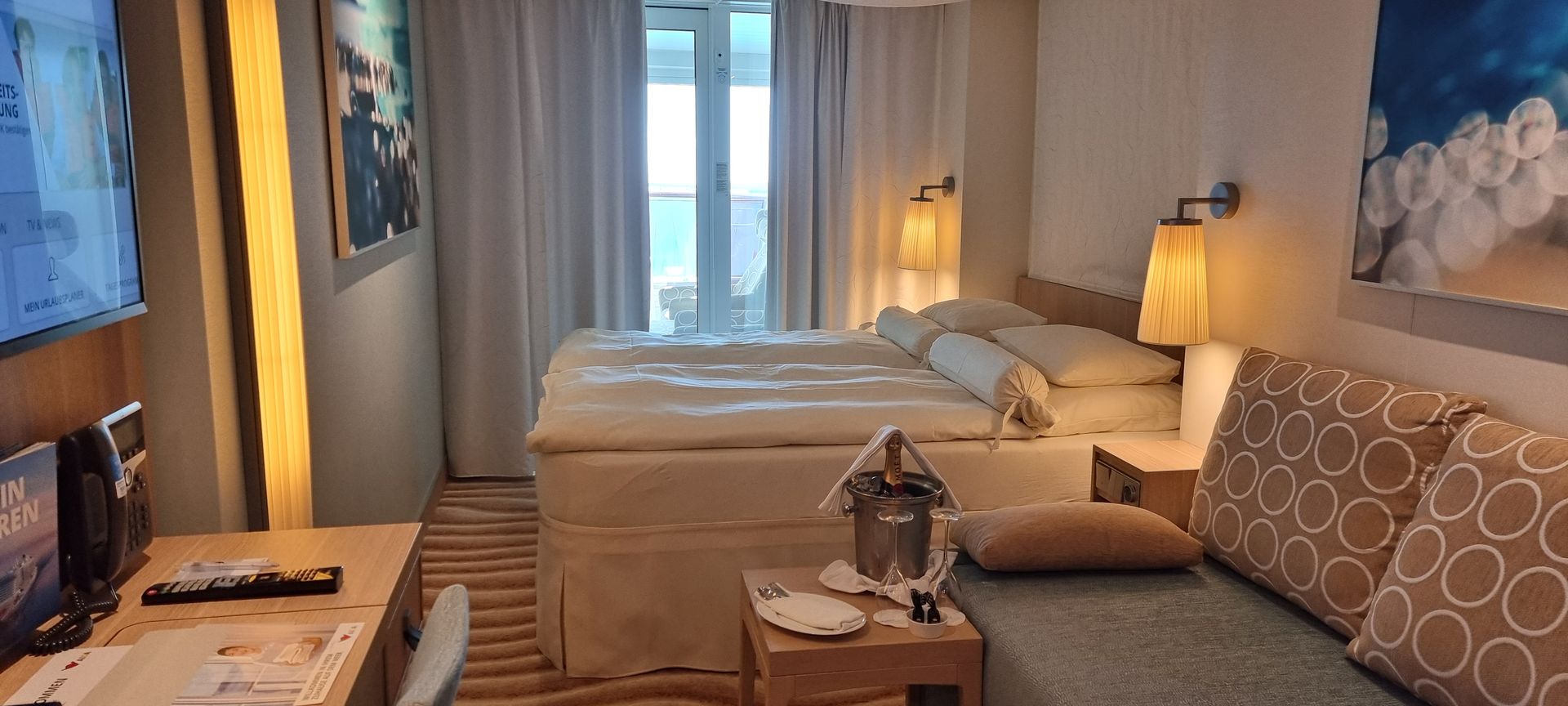 Es war eigentlich eher eine Notlösung, da es ein leichtes Kommunikationsproblem wegen des Buchungsstarts der neu aufgelegten Reise gab, wir jedoch gerne eine Balkonkabine auf Deck 6 auf der Steuerbordseite haben wollten und die anderen Kabinen schon weg waren.